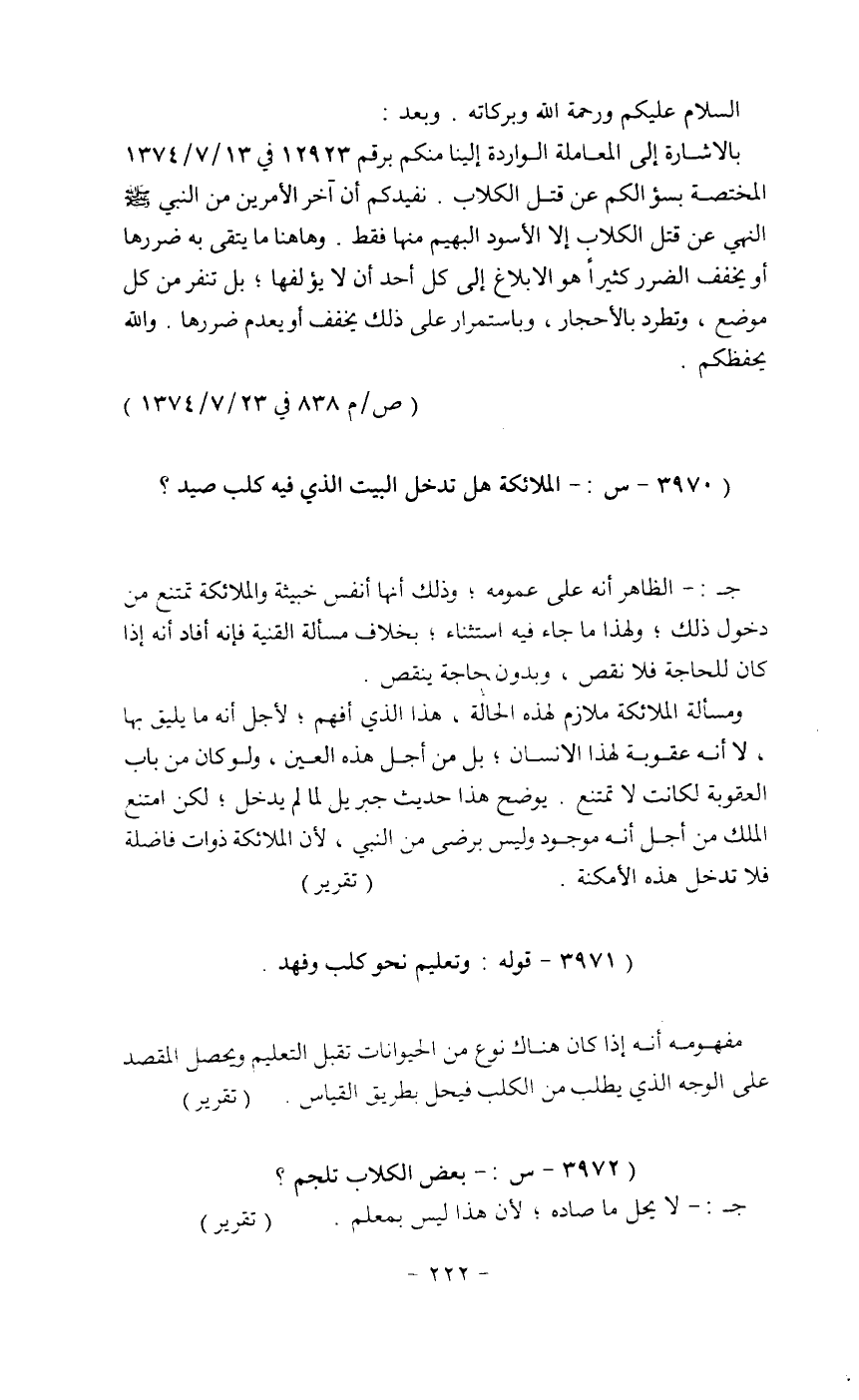 بإلاشارة إلى المعاملة الواردة إلينا منكم برقم 12923 في 13/7/1374 المختص بسوالكم عن قتل الكلاب نفيدكم أن أخر الأمرين من النبي - صلى الله عليه وسلم - النهى عن قتل الكلاب إلا إلاسود البهيم منها فقط وها هنا ما