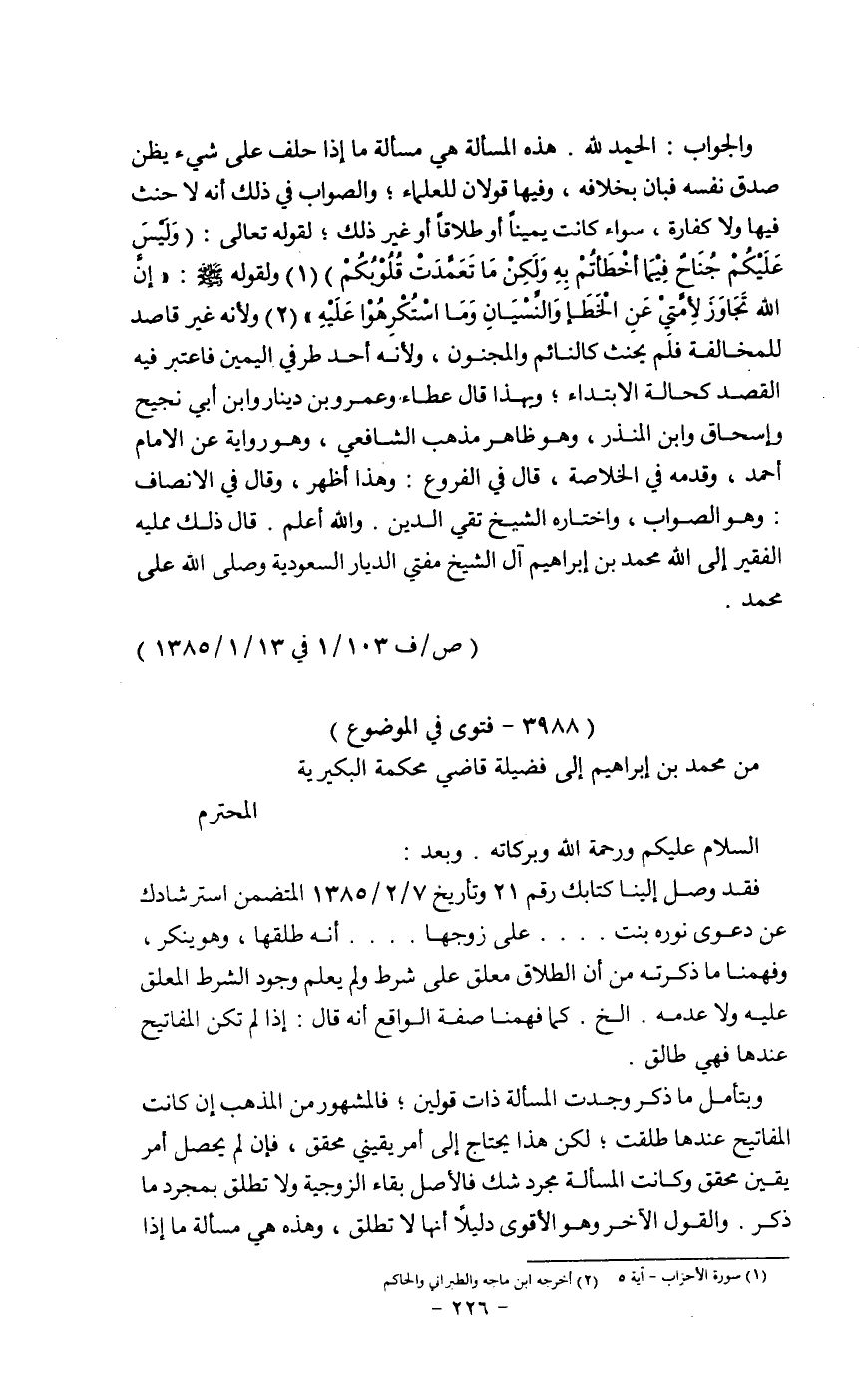 من محمد بن إبراهيم إلى فضيلة قاضي محكمة البكيرية.