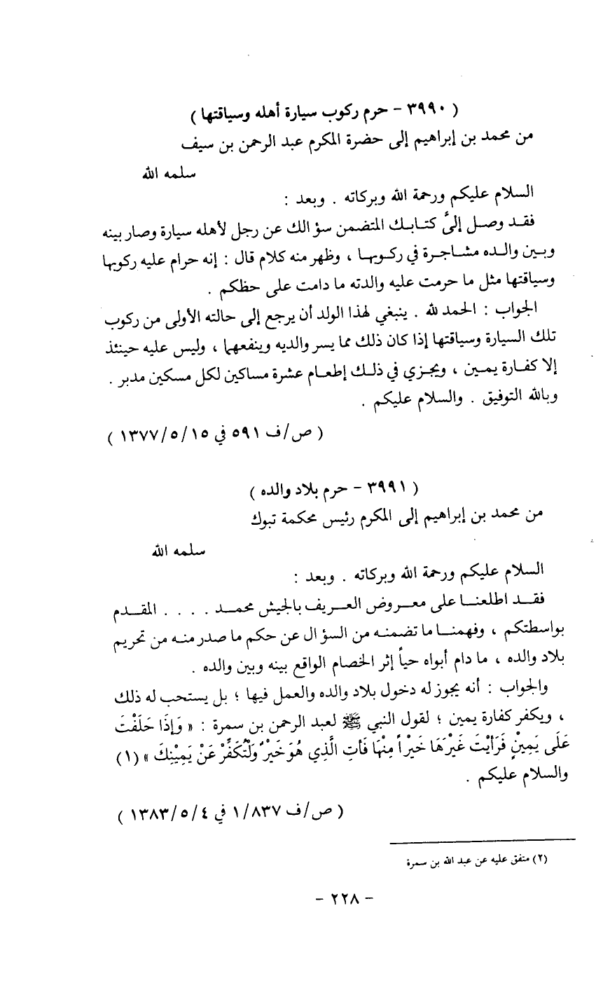 فقد وصل إلى كتابك المتضمن سؤالك عن رجل لاهله سيارة وصار بينه وبين والده مشاجرةفى ركوبها, وظهر منه كلام قال: أنه حرام عليه ركوبها وسياقتها