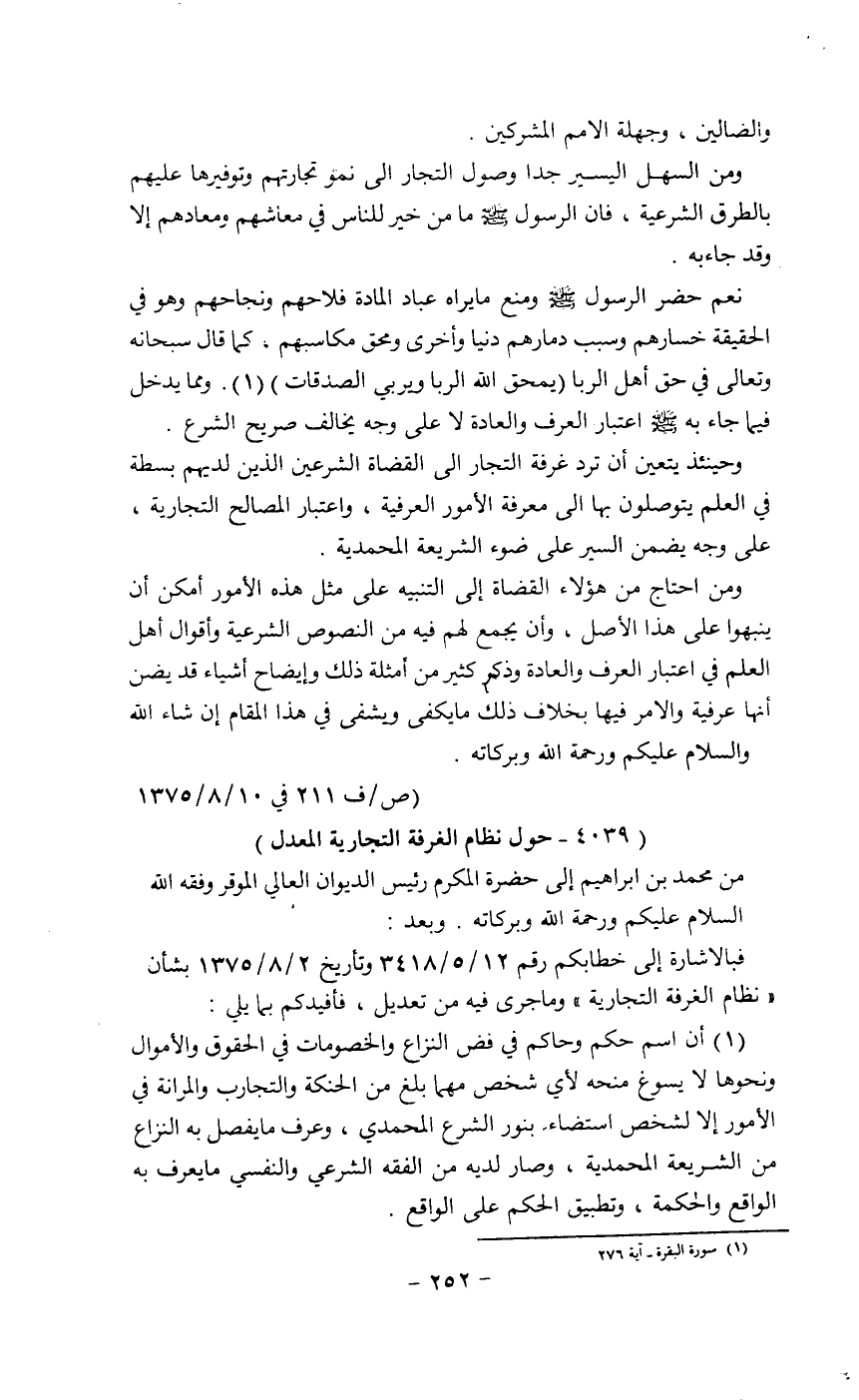 وحينئذ يتعين أن ترد غرفة التجارة إلى القضاة الشرعيين الذين لديهم بسطة في العلم يتوصلون بها إلى معرفة الأمور العرفية، واعتبار المصالح التجارية، على وجه يضمن السير على ضوء الشريعة المحمدية.