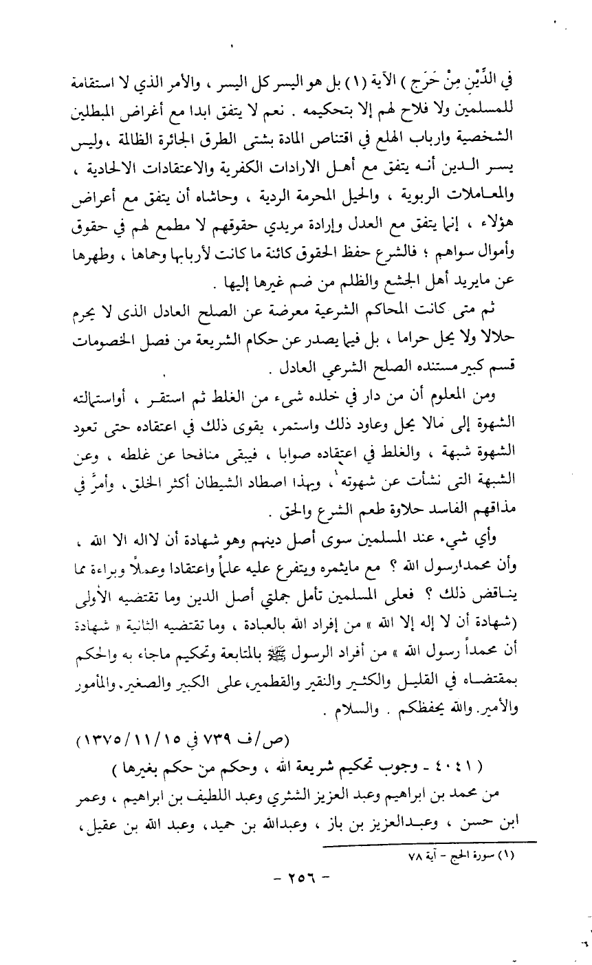ثم متى كانت المحاكم الشرعية معرضة عن الصلح العادل الذي لا يحرم حلإلا ولا يحل حراماً، بل فيما يصدر عن حكام الشريعة من فصل الخصومات قسم كبير مستنده الصلح الشرعي العادل.