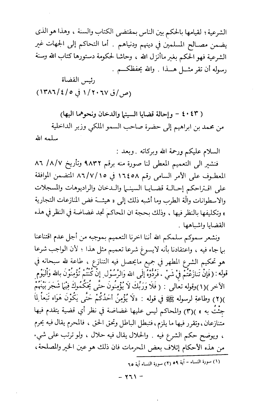 ونشعر سموكم سلمكم الله أننا أخرنا التعميم بموجبه من أجل عدم اقتناعنا بما جاء فيه، واعتقادنا بأنه لا يسوغ شرعاً تعميم مثل هذا؛ لأن الواجب شرعاً هو تحكيم الشرع المطهر في جميع ما يحصل فيه التنازع، طاعة لله سبحانه في قوله: (فإن تنازعتم في شيءء فردوه إلى الله والرسول إن كنتم تؤمنون بالله وإلىوم الآخر) (1) وقوله تعالى: (فلا وربك لا يؤمنون حتى يحكموك فيما شجر بينهم) (2) وطاعة لرسوله في قوله: " لا يؤمن أحدكم حتى يكون هواه تبعاً لما جئت به" والمحاكم ليس عليها غضاضة في نظر أي قضية يتقدم فيها متنازعان، وتقرر فيها ما يلزم، فتبطل الباطل وتحق الحق، فالمحرم يقال فيه يحرم، ويوضح حكم الشرع فيه. والحلال يقال فيه حلال، ولو ترتب على شيءء من هذه الأحكام إتلاف بعض المحرمات فإن ذلك هو عين الخير والمصلحة،