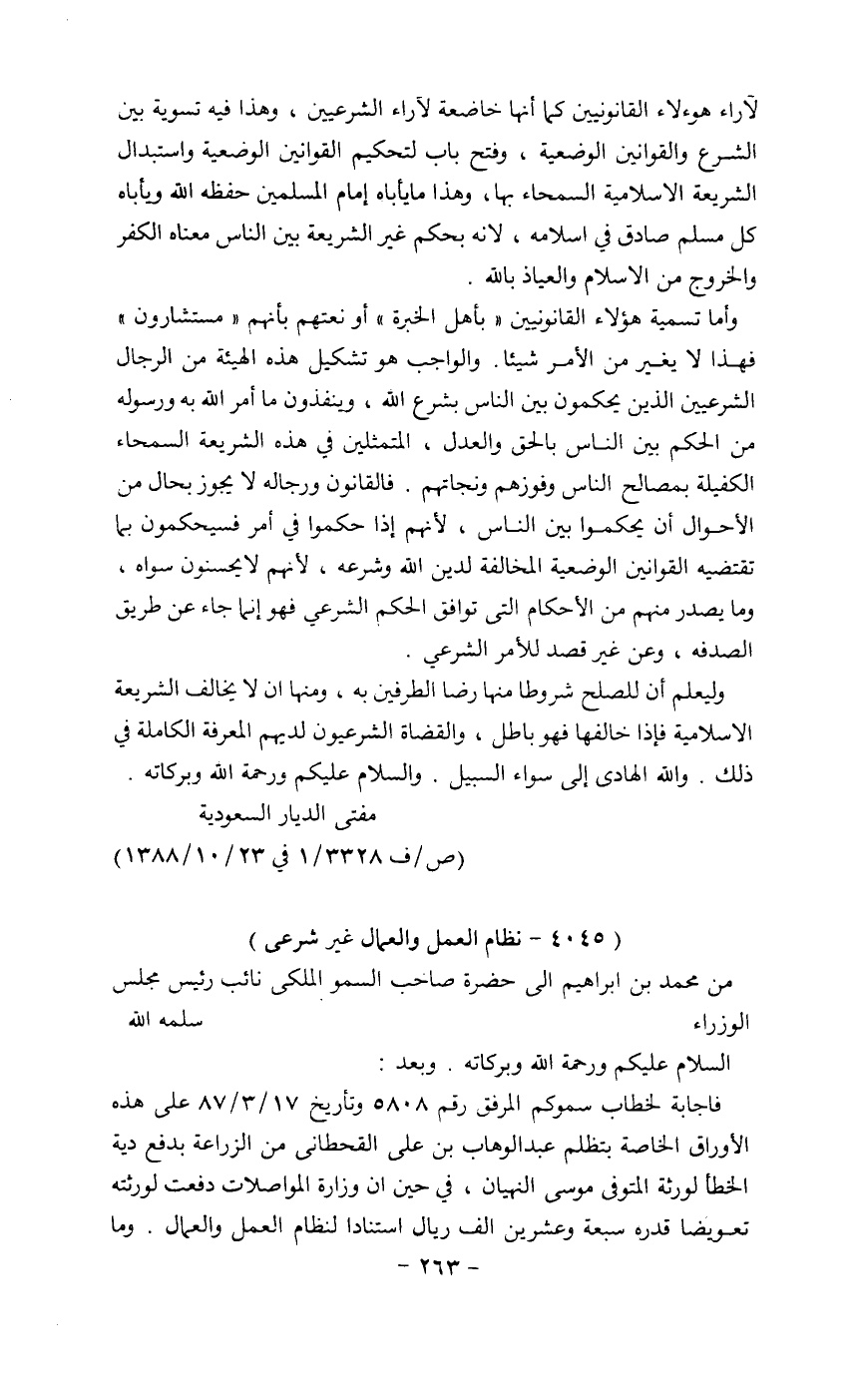 لأراء هؤلاء القانونيين كما أنها خاضعة لآراء الشرعيين، وهذا في تسوية بين الشرع والقوانين الوضعية، وفتح باب لتحكيم القوانين الوضعية واستبدال الشريعة الإسلامية السمحاء بها، وهذا ما يأباه إمام المسلمين حفظه الله، ويأباه كل مسلم صادق في إسلامه، لأنه بحكم غير الشريعة بين الناس معناه الكفر والخروج من الإسلام والعياذ بالله.