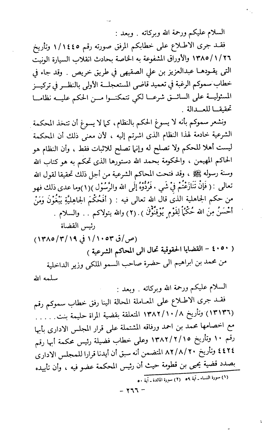 ونشعر سموكم بأنه لا يسوغ الحكم بالنظام، كما لا يسوغ أن تتخذ المحكمة الشرعية خادمة لهذا النظام الذي اشرتم إليه، لأن معني ذلك أن المحكمة ليست أهلا للحكم ولا تصلح له وانما تصلح للاثبات فقط، وأن النظام هو الحاكم المهيمن، والحكومة بحمد الله دستورها الذي تحكم به هو كتاب الله وسنه رسوله - صلى الله عليه وسلم - وقد فتحت المحاكم الشرعية من أجل ذلك تحقيقا لقول الله تعالى: (فان تنازعتم في شيء فردوه إلى الله والرسول) (1) وما عدي ذلك فهو من حكم الجاهلية الذي قال الله تعالى فيه: (أفحكم الجاهلية يبغون ومن أحسن من الله حكماً لقوم يوقنون) . (2) والله يتولاكم......... والسلام.