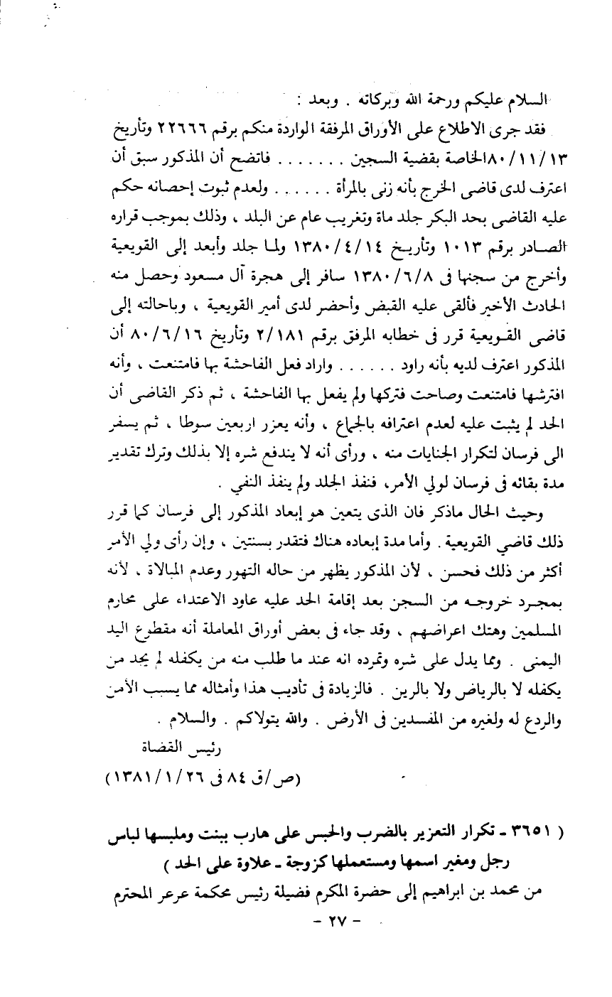 فقد جرى الإطلاع على الأوراق المرفقة الواردة منكم برقم 22666 وتاريخ 13/11/80 الخاصة بقضية السجين..... فاتضح أن المذكور سبق أن اعترف لدى قاضي الخرج بأنه زنى بالمرأة.... ولعدم ثبوت إحصانه حكم عليه القاضي بحد البكر جلد مائة وتغريب عام عن البلد، وذلك بموجب قراره الصادر برقم 1013 وتاريخ 14/4/1380 ولما جلد وأبعد إلى القويعية وأخرج من سجنها في 8/6/1380 سافر إلى هجرة آل مسعود وحصل منه الحادث الأخير فألقي القبض عليه وأحضر لدى أمير القويعية، وبإحالته إلى قاضي القويعية قرر في خطابه المرفق برقم 181/2 وتاريخ 16/6/80 أن المذكور اعترف بأنه راود.... وأراد فعل الفاحشة بها فامتنعت، وأنه افترشها فامتنعت وصاحت فتركها ولم يفعل بها الفاحشة، ثم ذكر القاضي أن الحد لم يثبت عليه لعدم اعترافه بالجماع، وأنه يعزر أربعين سوطاً، ثم يسفر إلى فرسان لتكرار الجنايات منه، ورأى أنه لا يندفع شره إلا بذلك وترك تقدير مدة بقائه في فرسان لولي الأمر، فنفذ الجلد ولم ينفذ النفي.