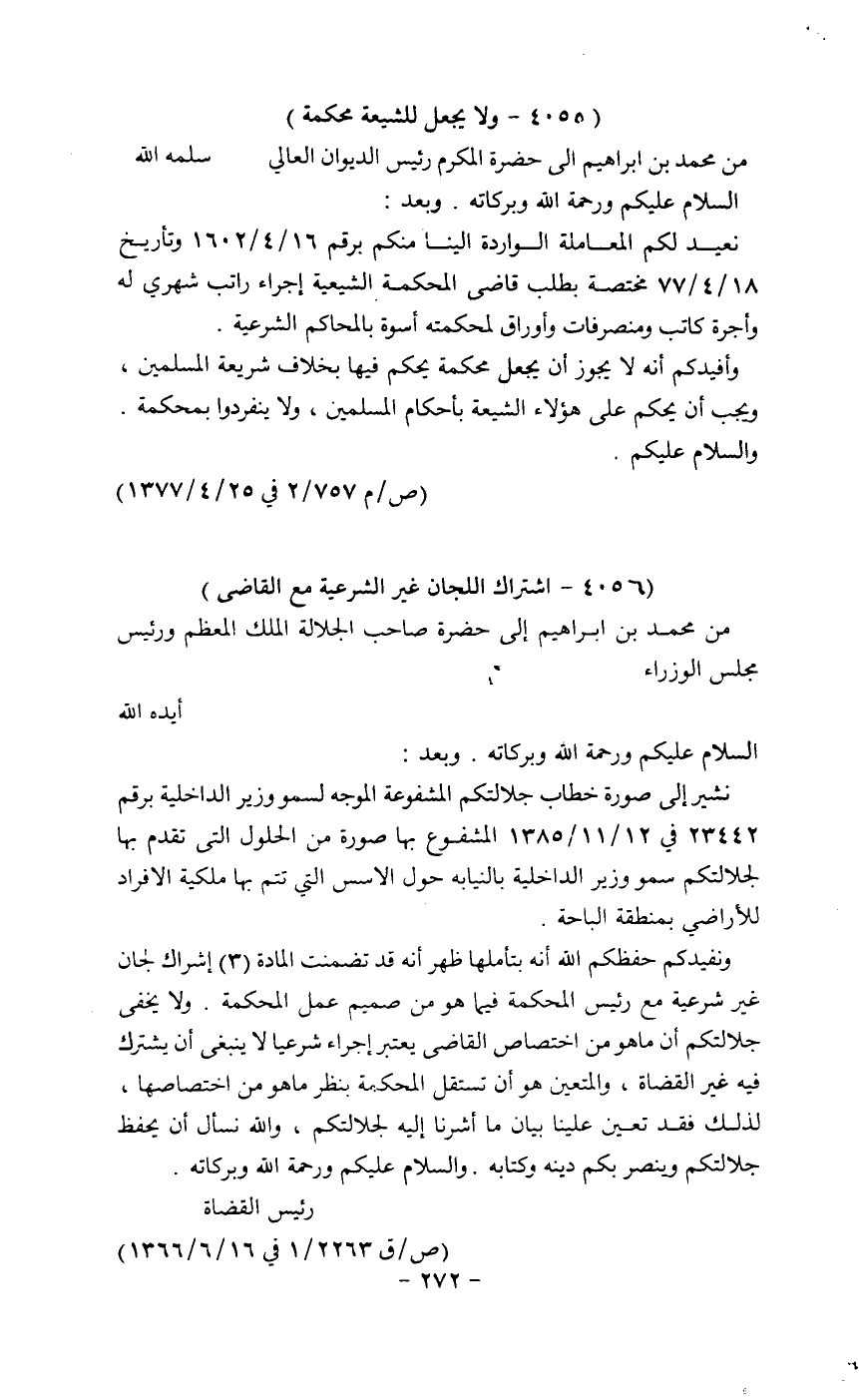 ونفيدكم حفظكم الله أنه بتاملها ظهر أنه قد تضمنت المادة (3) إشراك لجان غير شرعية مع رئيس المحكمة فيها هو من صميم عمل المحكمة. ولا يخفى جلالتكم أن ما هو من اختصاص القاضي يعتبر إجراء شرعياً لا ينبعي أن يشترك فيه غير القضاة، والمتعين هو أن تستقل المحكمة بنظر ما هو من اختصاصها، لذلك فقد تعين علينا بيان ما أشرنا إليه لجلالتكم، والله نسأل أن يحفظ جلالتكم وينصر بكم دينه وكتابه. والسلام عليكم ورحمة الله وبركاته.