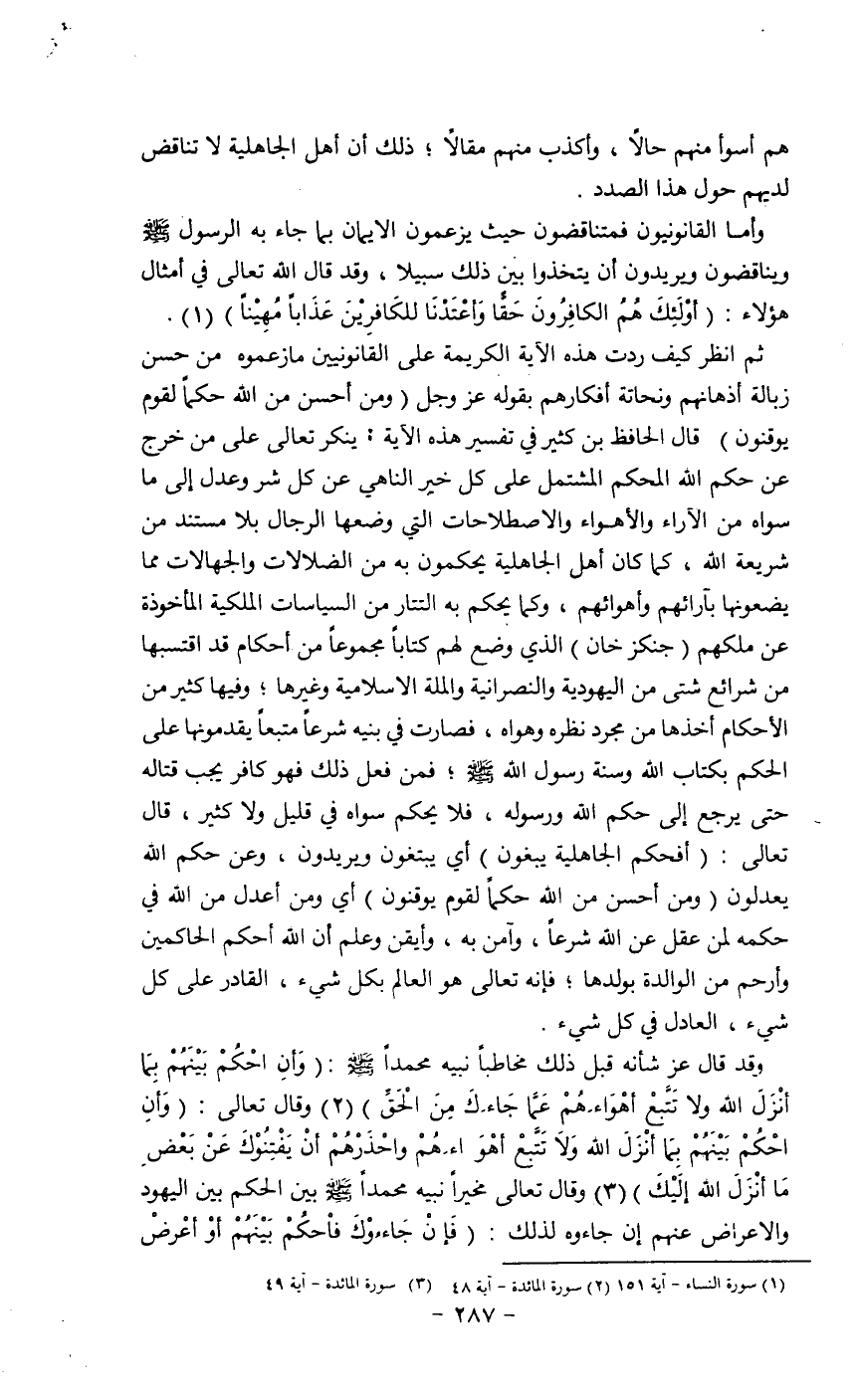 ثم انظر كيف ردت هذه إلأية الكريمة على القانونيين ما زعموه من حسن زبالة أذهانهم ونحاتة افكارهم بقوله تعالى عز وجل (ومن أحسن من الله حكماً لقوم يوقنون) قال الحافظ بن كثير في تفسيره هذه إلأية: ينكر تعالى على من خرج عن حكم الله المحكم المشتمل على كل خير الناهي عن كل شر وعدل إلى ما سواء من إلاراء وإلاهواء وإلاصطلاحات التي وضعها الرجال بلا مستند من شريعة الله، كما كان أهل الجاهلية يحكمون من الضلإلات والجهإلات مما يضعونها بآرائهم وأهوائهم، وكما يحكم به التتار من السياسات الملكية المأخوذة عن ملكهم (جنكيز خان) الذي وضع لهم كتابا مجموعاً من أحكام قد اقتبسها من شرائع شتى من إليهودية والنصرانية والملة الإسلامية وغيرها، وفيها كثير من الأحكام أخذها من مجرد نظره وهواه فصارت في بنية شرعاً متبعا يقدمونها على الحكم بكتاب الله وسنة رسول الله (ص) فمن فعل ذلك فهو كافر يجب قتاله حتى يرجع إلى حكم الله ورسوله فلا يحكم سواه في قليل ولا كثير قال تعال: (أفحكم الجاهلية يبغون) أي يبتغون ويريدون وعن حكم الله يعدلون (ومن أحسن من الله حكماًُ لقوم يوقنون) أي ومن أعدل من الله أحكم الحاكمين وأرحم من الوالدة بولدها فإنه تعالى هو العالم بكل شيءء القادر على كل شيءء العادل في كل شيءء.