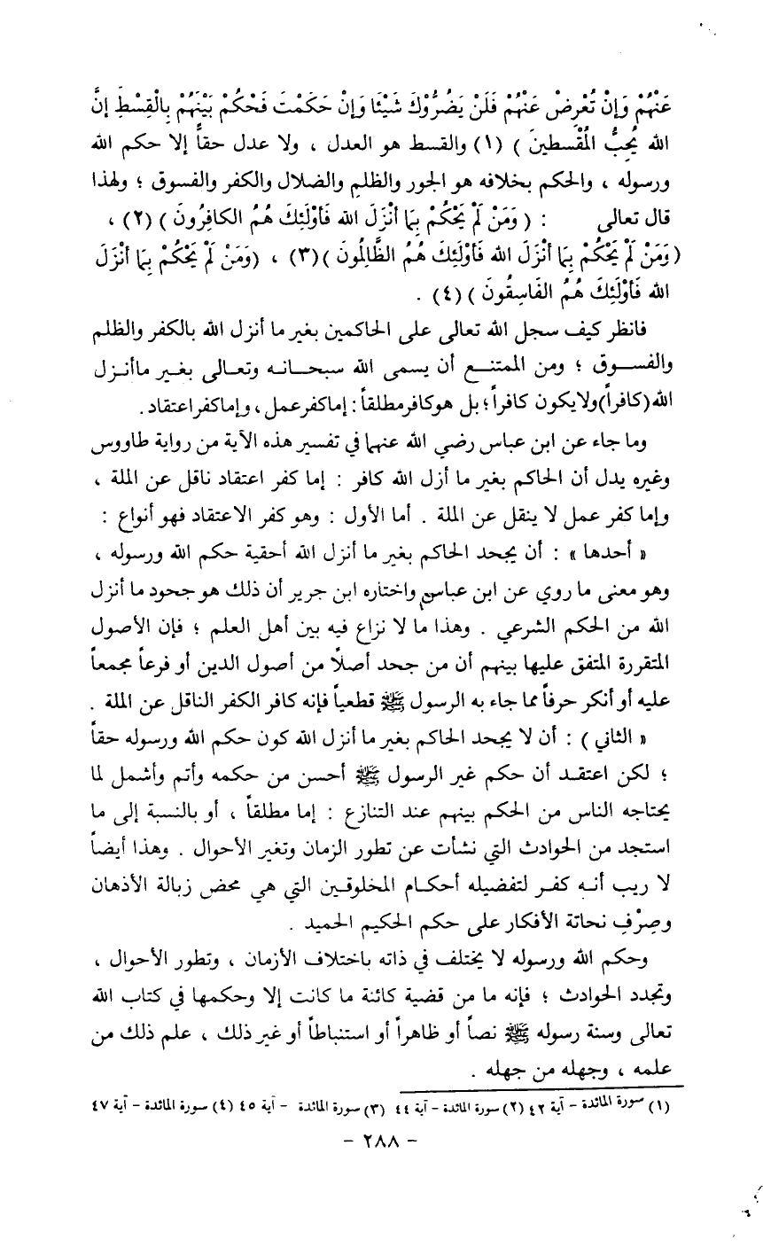 وما جاء عن ابن عباس رضي الله عنهما في تفسيره هذه إلأية من رواية طاووس وغيره يدل أن الحاكم بغير ما أنزل الله مافراً: إما كفر إلاعتقاد فهو أنواع: "أحدها": أن يجحد الحاكم بغير اأنزل الله أحقية حكم الله ورسوله وهو معنى ما روى عن ابن عباس واختاره ابن جرىر أن ذلك هو جحود ما أنزل الله من الحكم الشرعي وهذا لا نزاع فيه بين أهل العلم فإن الأصول المتقررة المتفق عليها بينهم أن من من جحد أصلاً من أصول الدين أو فرعاً مجمعاً عليه أو أنكر حرفاً مما جاء به الرسول (ص) قطعياً فإنه كافر الكفر الناقل عن الملة