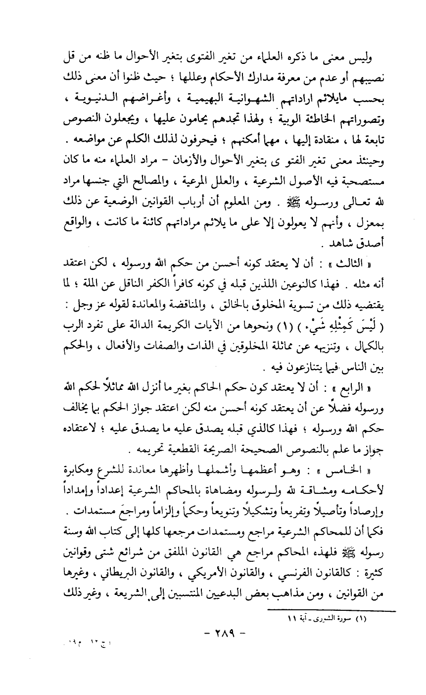 وليس معنى ما ذكره العلماء من تغير الفئوي بتغير إلاحوال ما ظنه من قل نصيبهم أو عدم من معرفة مدارك الأحكام وعللها حيث ظنوا أن معنى ذلك بحسب ما يلائم إرادتهم الشهوانية البهيمية وأغراضهم الدنيوية وتصوراتهم الخاطئة الويبة ولهذا تجدهم يحامون عليها ويجعلون النصوص تابعة لها منقادة إليها مهما أمكنهم فيحرفون لذلك الكلم عن موضعه وحينئذ معنى تغير الفتوى بتغير إلاحوال وإلازمان مراد العلماء منه ما كان مستصحبة فيه إلاص3ول الشرعية والعلل المرعية والمصالح التي جنسها مراد لله تعالى ورسوله (ص) ومن المعلوم أن أرباب القوانين الوضعية عن ذلك بمعزل وأنهم لا يعزلون إلا على ما يلائم مراداتهم كائنة ما كانت والواقع أصدق شاهد.
