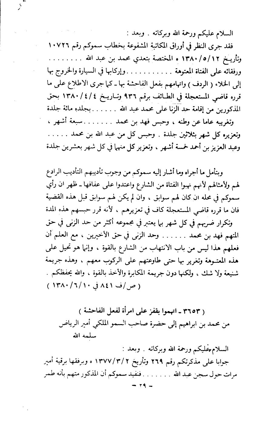 فقد جرى الإطلاع على أوراق المكاتبة المشفوعة بخطاب سموكم رقم 10726 وتاريخ 12/5/1380 المختصة بتعدي محمد بن عبد الله.... ورفقائه على الفتاة المعتوهة.... وإركابها في السيارة والخروج بها إلى الخلاء (الردف) واتهامهم بفعل الفاحشة بها - كما جرى الإطلاع على ما قرره قاضي المستعجلة في الطائف برقم 936 وتاريخ 4/4/1380 بحق المذكورين من إقامة حد الزنا على محمد عبد الله.... بجلده مائه جلدة وتغريبه عاماً عن وطنه، وحبس فهد بن محمد ... سبعة أشهر، وتعزيره كل شهر بثلاثين جلدة. وحبس كل من عبد الله بن محمد ... وعبد العزيز بن أحمد خمسة أشهر، وتعزير كل منهما في كل شهر بعشرين جلدة.