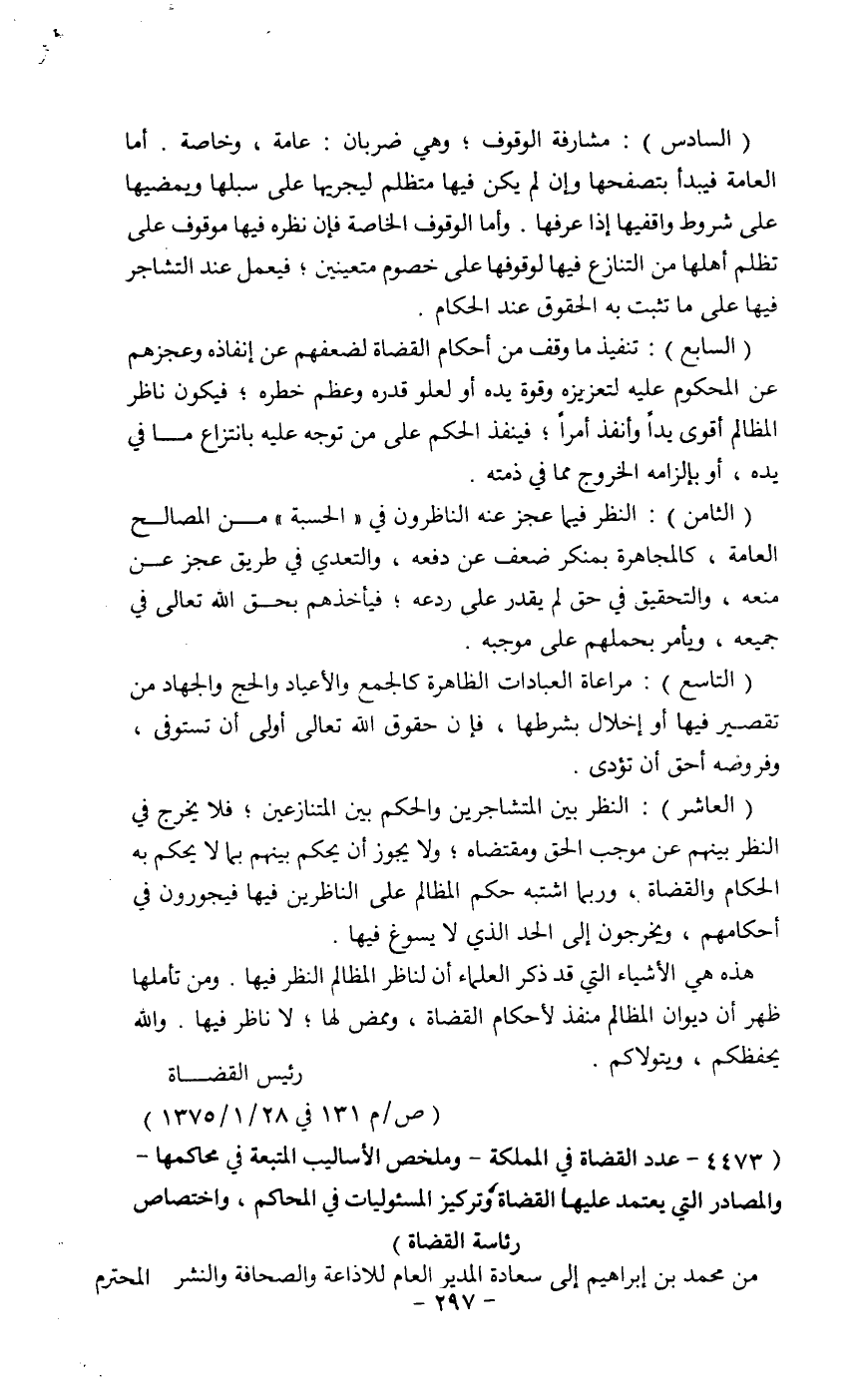 (العاشر) النظر بين المتشاجرون والحكم بين المتنازعين فلا يخرج في النظر بينهم عن موجب الحق ومقتضاة ولا يجوز ان يحكم بينهم بما لا يحكم به الحكام والقضاة وربما اشبه حكم المظالم على الناظرين فيها فيجورون في احكتمهم ويخرجون إلى الحد الذي لا يسوغ فيها هذه هي إلاشيءاء التي قد ذكر العلماء ان لناظر المظالم النظر فيها ومن تأملها ظهر ان ديوان المظالم منفذ لاحكام القضاة وممض لها لا ناظر فيها والله يحفظكم ويتولاكم