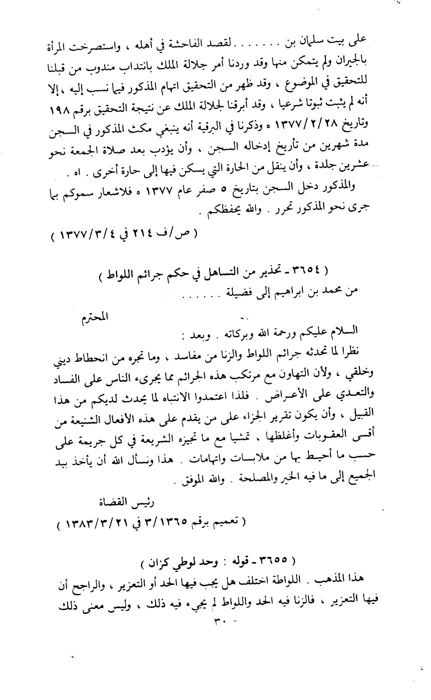 نظراً لما تحدثه جرائم اللواط والزنا من مفاسد، وما تجره من انحطاط ديني وخلقي، ولن التهاون مع مرتكب هذه الجرائم مما يجرئ الناس على الفساد والتعدي على الأعراض. فلذا اعتمدوا الانتباه لما يحدث لديكم من هذا القبيل، وأن يكون تقرير الجزاء على من يقدم على هذه الأفعال الشنيعة من أقسى العقوبات وأغلظها. تمشياً مع ما تجيزه الشريعة في كل جريمة على حسب ما أحيط بها من ملابسات واتهامات. هذا ونسأل الله أن يأخذ بيد الجميع إلى ما فيه الخير والمصلحة. والله الموفق.