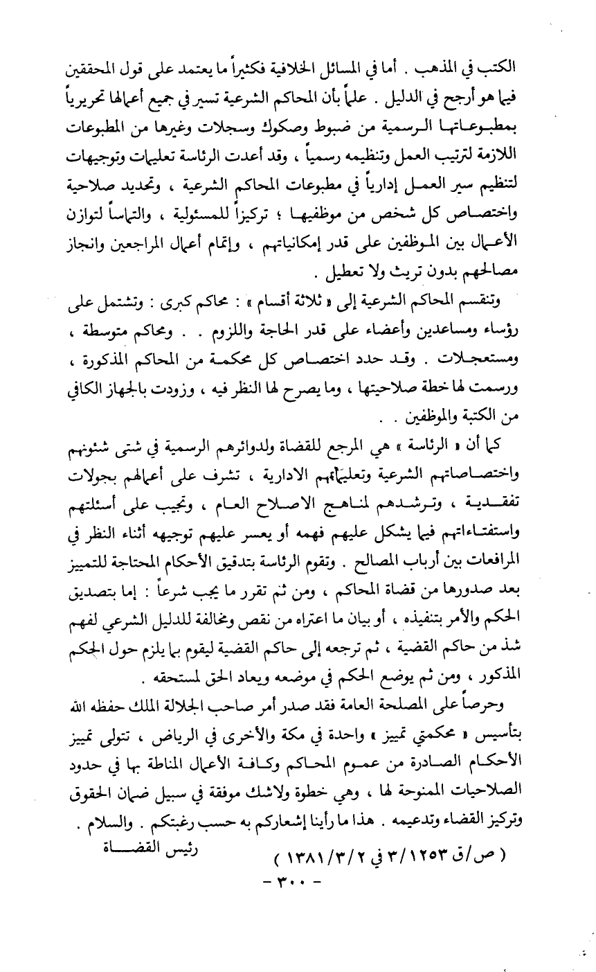 وحرصاً على المصلحة العامة فقد صدر أمر صاحب الجلالة الملك حفظه الله بتأسيس "محكمتى تمييز" واحدة في مكة الآخرى في الرياض تتولى تمييز الأحكام الصادرة من عموم المحاكم وكافة إلاعمال المناطة بها في حدود الصلاحيات الممنوحة لها، وهي خطوة ولاشك موفقة في سبيل ضمان الحقوق وتركيز القضاء وتدعيمه هذا ما رأينا إشعاركم به حسب رغبتكم. والسلام