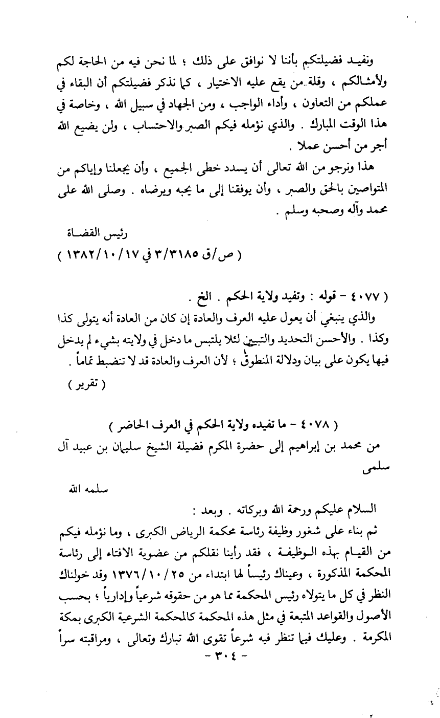 ثم بناء على شغور وظيفة رئاسة محكمة الرياض الكبرى وما نؤمله فيكم من القيام بهذه الوظيفة فقد رأينا نقلكم من عضوية إلافتاء إلى رئاسة النظر في كل ما يتولاه رئيس المحكمة مما هو من حقوقه شرعياً وإدارياً وبحسب الأصول والقواعد المتبعة في مثل هذه المحكمة كالمحكمة الشرعية الكبرى بمكة المكرمة وعليك فيما تنظر فيه شرعياً تقوى الله تبارك وتعالى ومراقبته سراً