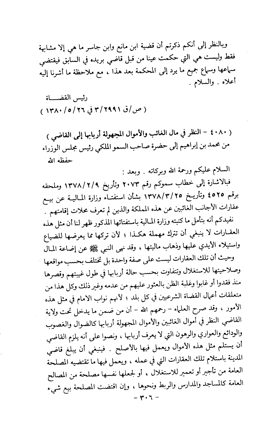 (4080 - النظر في مال الغائب وإلاموال المجهولة أرابابها إلى القاضي)