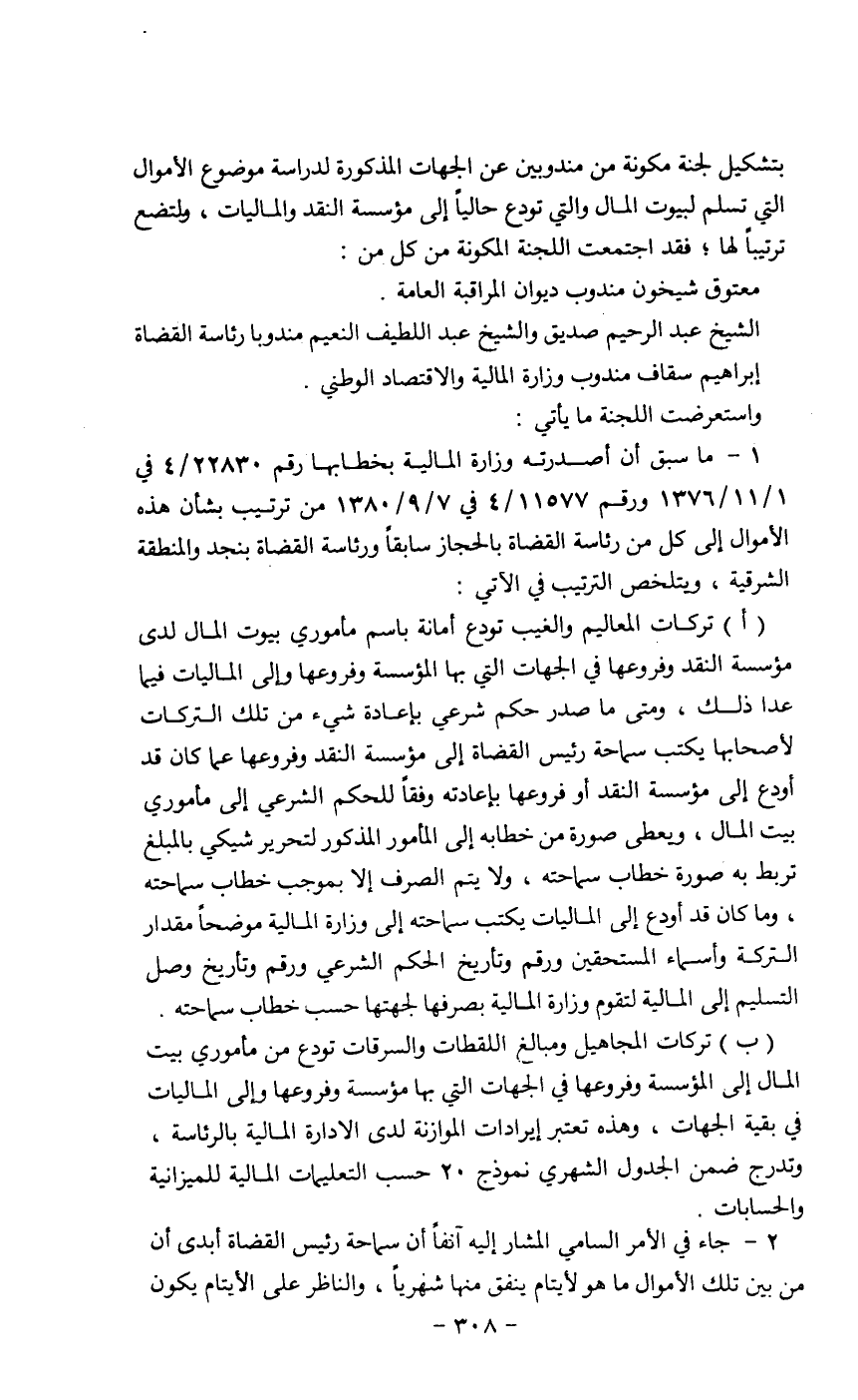 ما سبق أن أصدرته وزارة المالية بخطابها رقم 22830/4 في 1/11/1376 ورقم 11577/4 في 7/9/1380 من ترتيب بشأن هذه إلاموال إلى كل من رئاسة القضاة بالحجاز سابقا ورئاسة القضاة نجد والمنطقة الشرقية، ويتلخص الترتيب في إلاتي: