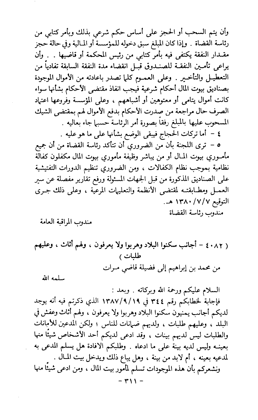 فإجابه لخطابكم رقم 344 في 19/9/1387 الذي ذكرتم فيه أنه يوجد لديكم اجانب يمنيون سكنوا البلاد وعربوا ولا يعرفون، ولهم اثاث وعف في البلد، وعليهم طلبات، ولديهم ضمانات للناس، ولكن المدهين للاامانات والطلبات ليس لديهم بينات، وقد ادعى لديكم احد الأشخاص شيءئا منها بعينه وليس لديه بينه على ما ادعاه. وطلبكم إلافادة هل يسلم المدعي به لمدعية بعينة، ثم لابد من بينة، وهل يباع ذلك ويدحل بيت المال.