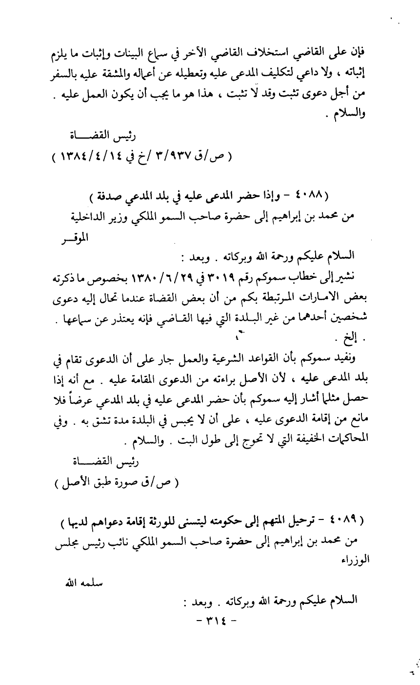 نشيءر إلى خطاب سموكم لرقم 3019 في 29/6/1380 بخصوص ما ذكرته بعض إلامارات المرابطة بكم من أن بعض القضاة عندما تحال إليه دعوى شخصين أحدهما من غير اللدة التي فيها القاضي فإنه يعتذر عن سماعها الخ.