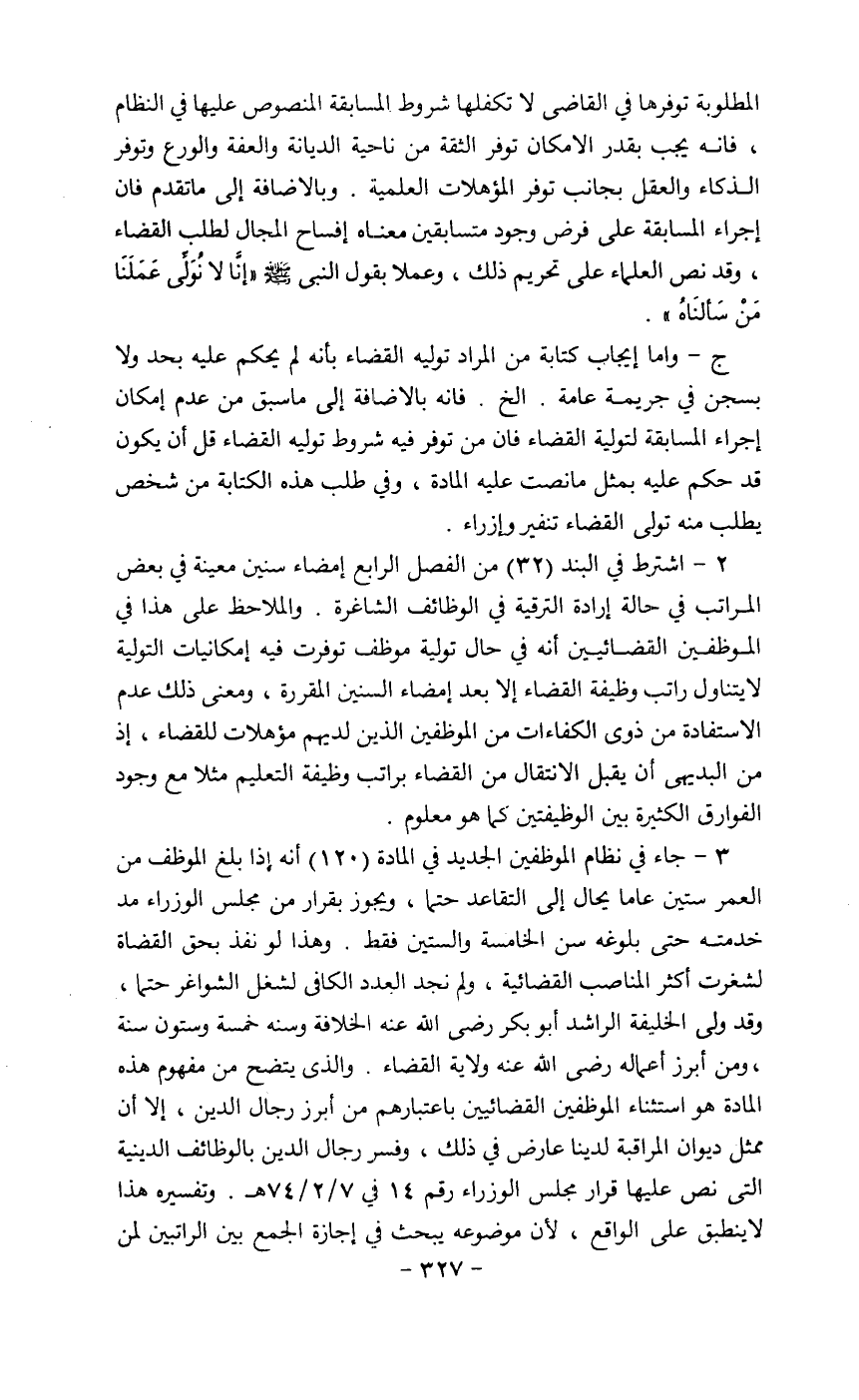 3- جاء في نظام الموظفين الجديد في المادة (120) أنه إذا بلغ الموظف من العمر ستين عاما يحال إلى التقاعد حتما ويجوز بقرار من مجلس الوزراء مد خدمته حتى بلوغه سن الخامسة والستين فقط وهذا لو نفذ بحق القضاة لشغرت أكثر المناصب القضائية ولم نجد العدد الكافي لشغل الشواغر حتما وقد ولى الخليفة الراشد أبو بكر رضي الله عنه الخلافة وسنة خمسة وستون سنة ومن أبرز أعماله ولأية القضاء والذي يتضح من مفهوم هذه المادة هو استثناء الموظفين باعتبارهم من أبرز الرجال الدين إلا أن ممثل ديوان المراقبة لدينا عارض في ذلك وفسر رجال الدين بالوظائف الدينية التي نص عليها قرار مجلس الوزراء رقم 14 في 7/2/74 هـ وتفسيره هذا لا ينطبق على الواقع لأن موضوعه يبحث في إجازة بين الراتبين لمن