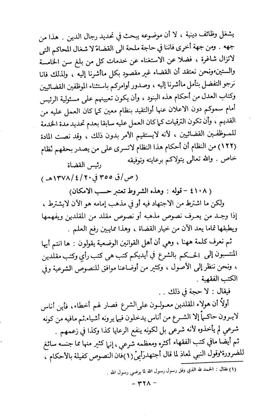 يشغل وظائف دينية لا أن موضوعه يبحث في تحديد رجال الدين هذا من جهه ومن جهه أغخرى فأننا في حاجة ملحة إلى القضاء لا شغال المحاكم التي لا تزال شاغرة فضلا عن إلاستغناء عن خدمات كل من بلغ سن الخامسة والستين ونحن نعتقد أن القضاء غير مقصود بكل ما أشرنا إليه ولذلك فأنا نرجو التفضل بتإلامل ما أشرنا إليه وصدور أوامركم باستثناء الموظفين القضائيين وكتاب العدل من أحكام هذه البنود وأن يكون تعيينهم على مسئولية الرئيس أمام سموكم دون إلاعلأن عنها أو التقيد بنظام معين كما كان عليه من القديم وأن تكون الترقيات كما كان العمل عليه سابقاً بعدم تحديد مدة الخدمة للموظفين القضائيين لأنه لا يستقيم الأمر بدون ذلك وقد نصت المادة (122) من النظام أن أحكام هذا النظام لا تسري على من يصضدر بحقهم نظام خاص والله تعالى يتولاكم برعايته وتوفيقه