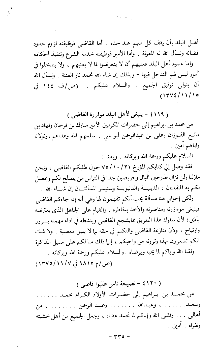 اهل البلد بان يقف كل منهم عند حدء اما القاضي فوظيفتة لزوم حدود قضائه وتسأل الله له المعرفة واما الأمير فوظيفتة خدمة الشرع وتنفيذ احكامه واما عموم اهل البلد فعليهم ان لا يتعرضوا لما لا يعينهم ولا يتدخلوا في امور ليس لهم التدخل فيها وبذلك ام شاء الله تخمد نار الفئة ونسأل الله أن يتولي توفيق الجميع والسلام عليكم (ص/ق 144في 15/11/1374)