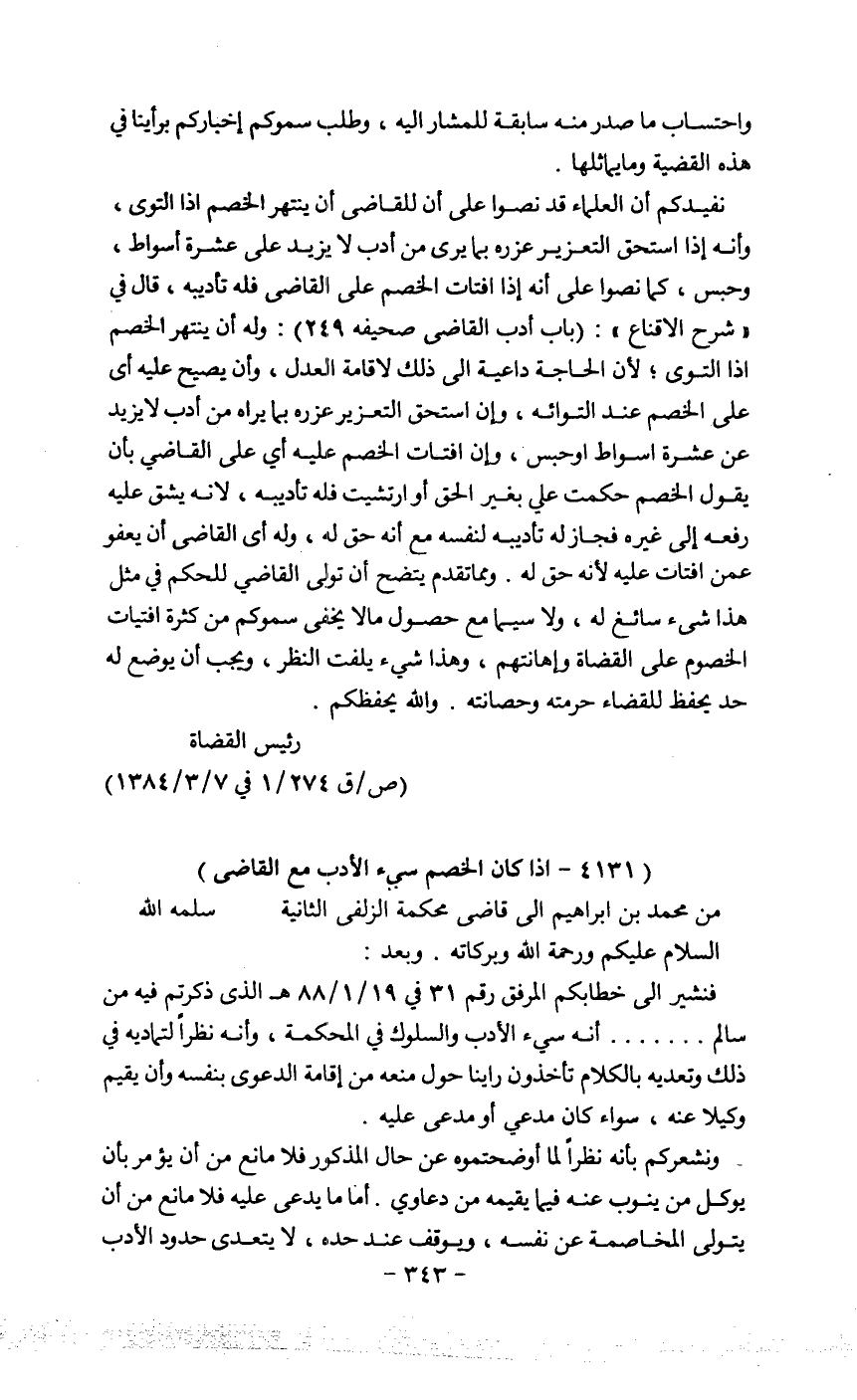 واحتساب ما صدر منه ثابقه للمشار إليه وطلب سموكم اخباركم برأينا في هذه القضية وما يماثلها نفيذكم ان العلماء قد تصوا على ان للقاضي ان ينتهز الخصم إذا التوي وانه إذا استحق العزيز عزره بما يري من ادب لا يزيد على عشرة اسواط وحبس كما نصوا على انه إذا افئات الخصم على القاضي فله تأدينه قال ي