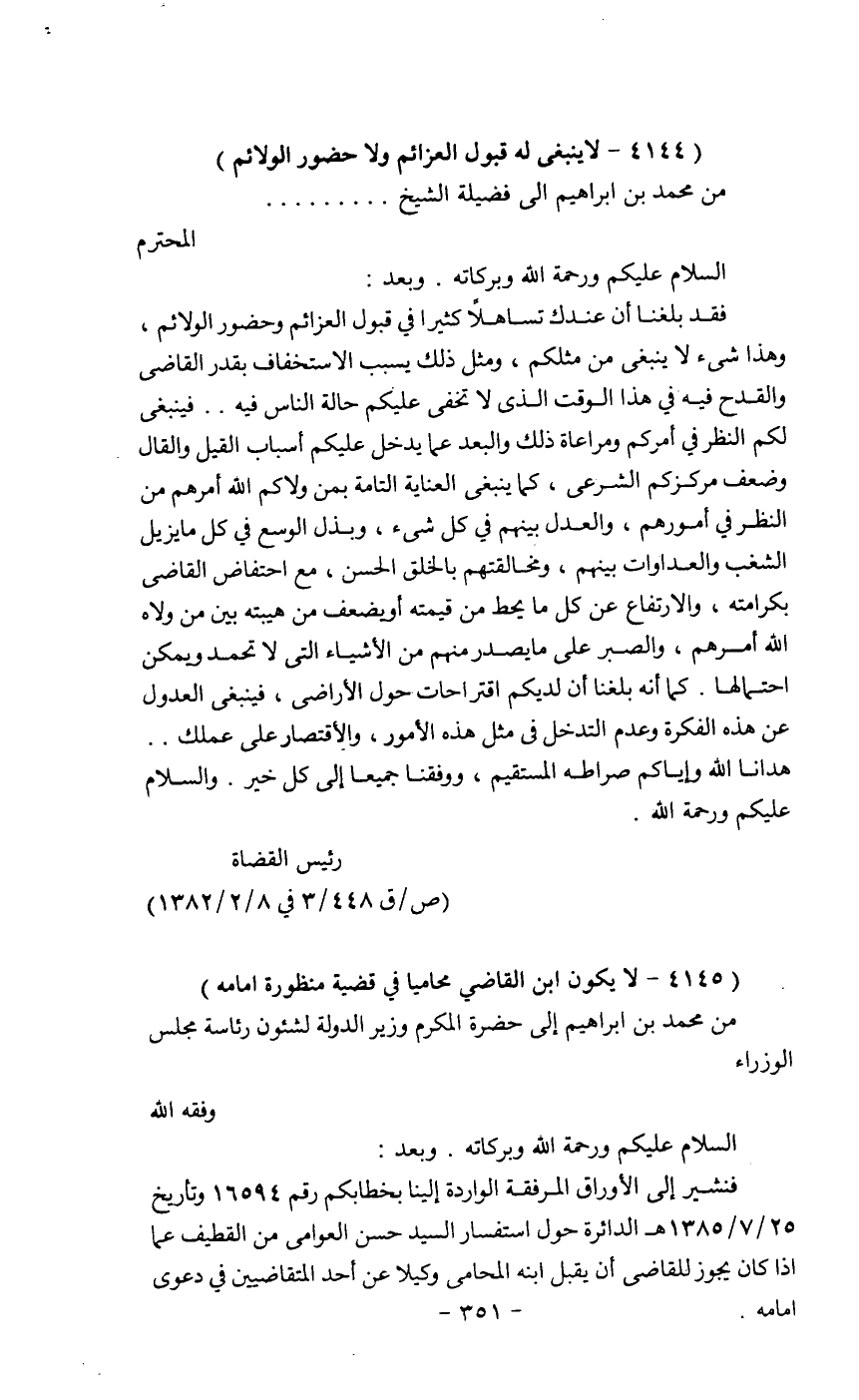 فقد بلغنا ان عندكم تساهلا كثيرا في قبول العزائم وحضروا الولائم وهذا شيءء لا ينبغي من مثلكم ومثل ذلك بسبب الإستخفاف يقدر بقدر القاضي والقدح فيه في هذا الوقت الذي لا تخفي عليكم حالة الناس فيه.... فينبغي لكم النظر في امركم ومرعاة ذلك والبعد عما يدخل عليكم أسباب القتل والقال وضعف مركزكم الشرعي كما ينبغي العناية التامه بمن ولاكم الله أمرهم من النظر في امورهم والعدل بينهم في كل شيءء وبذل الوسع في كل ما يزيل الشغب والعداوات بينهم ومخالقتهم بالخلق الحسن مع احتفاض القاضي بكرامته، وإلارتفاع عن كل ما يحيط من قيمته أويضعف من هيبته بين من ولاه الله امرهم والصبر على ما يصدر منهم من إلاشيءاء التي لا تحمد ويمكن احتمالها كما انه بلغنا ان لديكم اقتراحات حول إلاراضي فينبغي العدول عن هذه الفكرة وعدم التدخل في مثل هذه الأمور وإلاقيصار على عملك هدانا الله واياكم صراطه المستقيم ووفقنا جميعا إلى كل خير والسلام عليكم ورحمة الله