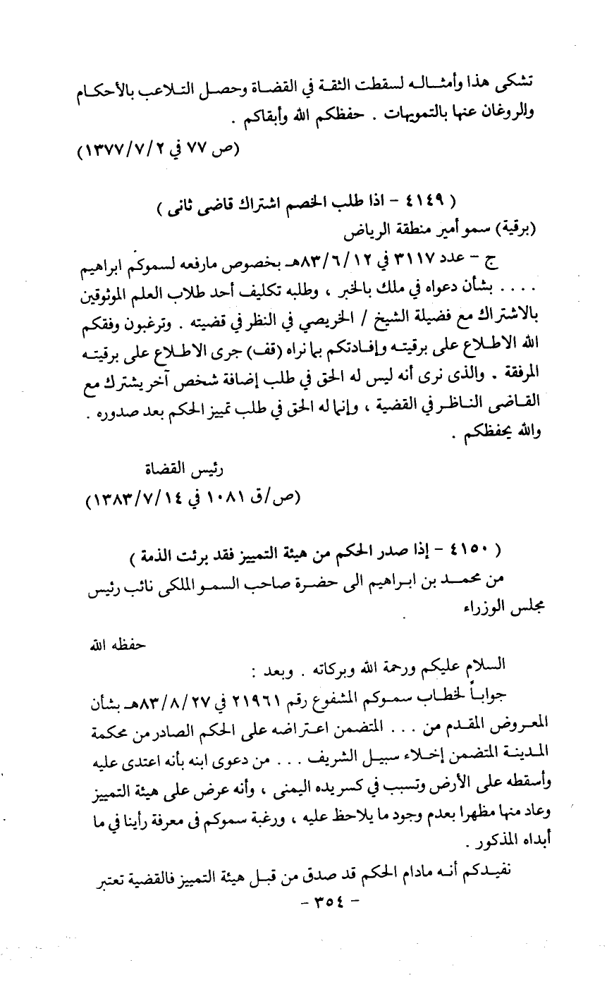 ج- عدد 3117 في 12/ 6/ 83هـ بخصوص ما رفعه لسموكم إبراهيم...... بشأن دعواة في ملك بالخير وطلبه تكليف احد طلب العلم الموثوقين بإلاشتراك مع فضيلة الشيخ / الخريصي في النظر في قضية وترغبون وفقكم الله الإطلاع على برقية وافادتكم بما نراه (قف) جرى الإطلاع على برقية المرفقة الناظر في القضية وانما له الحق في طلب تمييز الحكم بعد صدوه والله يحفظكم