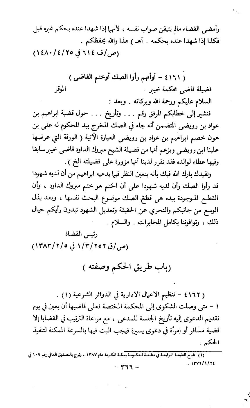 فنشيءر إلى خطابكم المرفق رقم........ وتاريخ........ز حول فضية إبراهيم بن عواد بن رويض المتضمن أنه جاء في الشك المخرج بيد المحكوم له على بن هون خصم إبراهيم بن عواد بن رويض العبارة إلاتية (الورقة التي عرضها علينا وريض وبرغم من فضيلة الشيخ مبروك الدارد قاضي خيبر سابقا وفيها عطاء لوالده فقد تقرر أنها مزورة على فضيلة الخ)