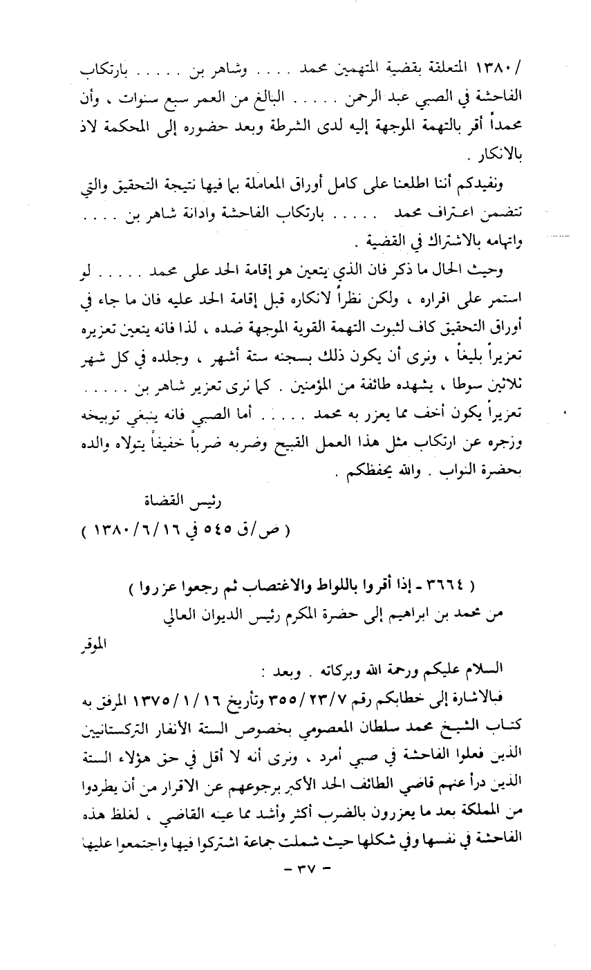 فبالإشارة إلى خطابكم رقم 7/23/55 وتاريخ 16/1/1375 المرفق به كتاب الشيخ محمد سلطان المعصومي بخصوص الستة الأنفار التركستانيين الذين فعلوا الفاحشة في صبي أمرد، ونرى أنه لا أقل من حق هؤلاء الستة الذين درأ عنهم قاضي الطائف الحد الأكبر بجريمتهم عن الإقرار من أن يطردوا من المملكة بعد ما يعزرون بالضرب أكثر وأشد مما عينه القاضي، لغلظ هذه الفاحشة في نفسها وفي شكلها حيث شملت جماعة التركوا فيها واجتمعوا عليها