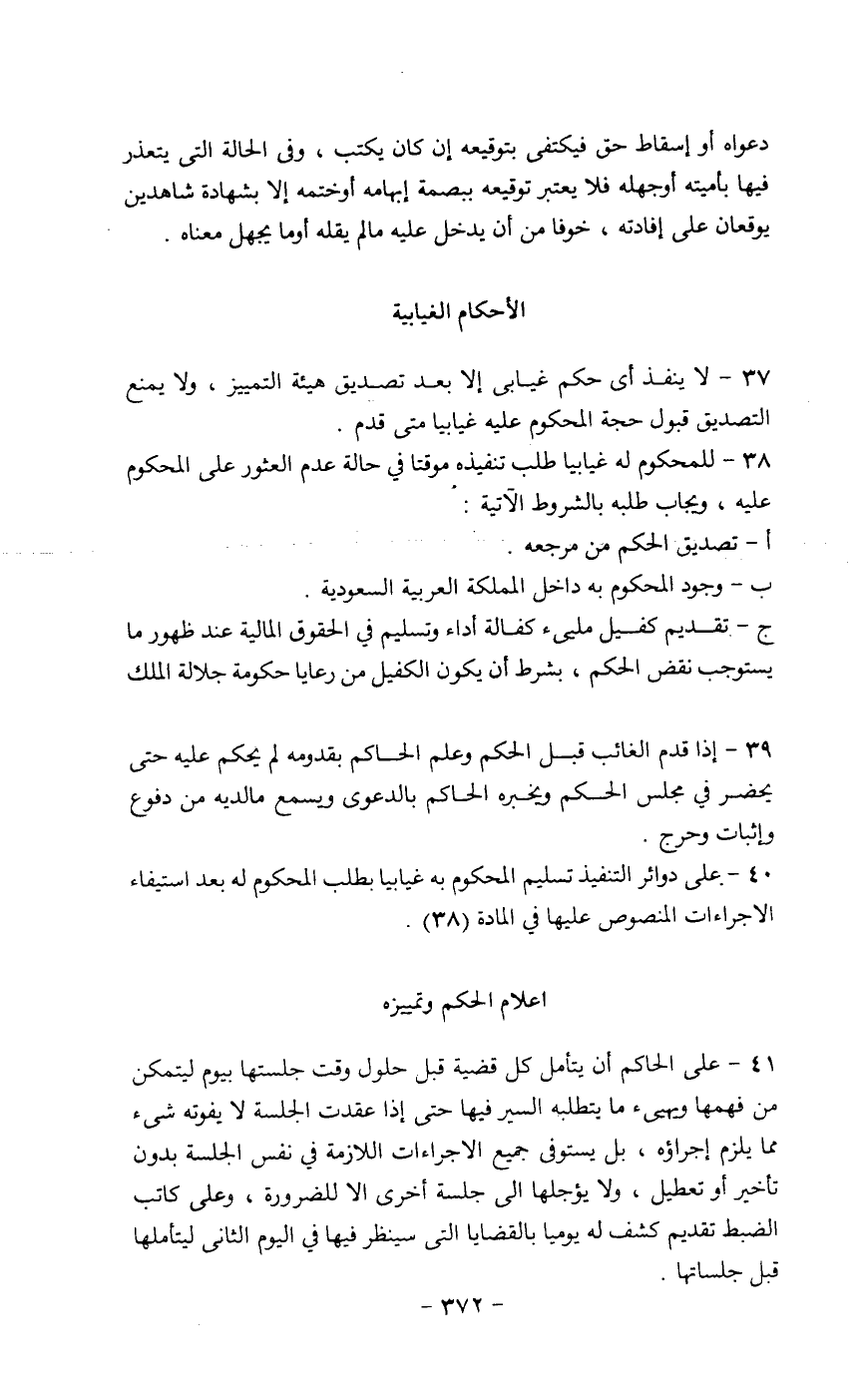 37- لا بنفذ أي حكم غيابي إلا بعد تصديق عيئة التمييز، ولا يمنع التصديق قبول حجة المحكوم عليه غيابيا متى قدم.