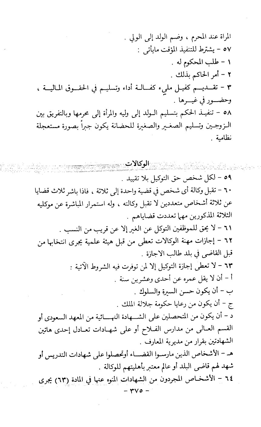 58- تنفيذ الحكم بتسليم الولد إلى وليه والمراة إلى محرمها وبالتفريق بين الزوجين وتسليم الصغير والصغيرة للحضانة يكون جبراً بصورة مستعجلة نظامية.