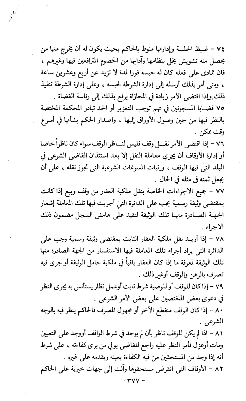 76- إذا اقتضي الأمر نقل وقت فليس لناظر الوقف سواء كان ناظراً خاصا أو ادارة إلاوقاف أن يجرى معاملة النقل إلا بعد استئذان القاضي الشرعي في البلد التي فيها الوقف واثبات المسوغات الشرعية التي تجوز نقلة على ان يجعل ثمنه في الحال