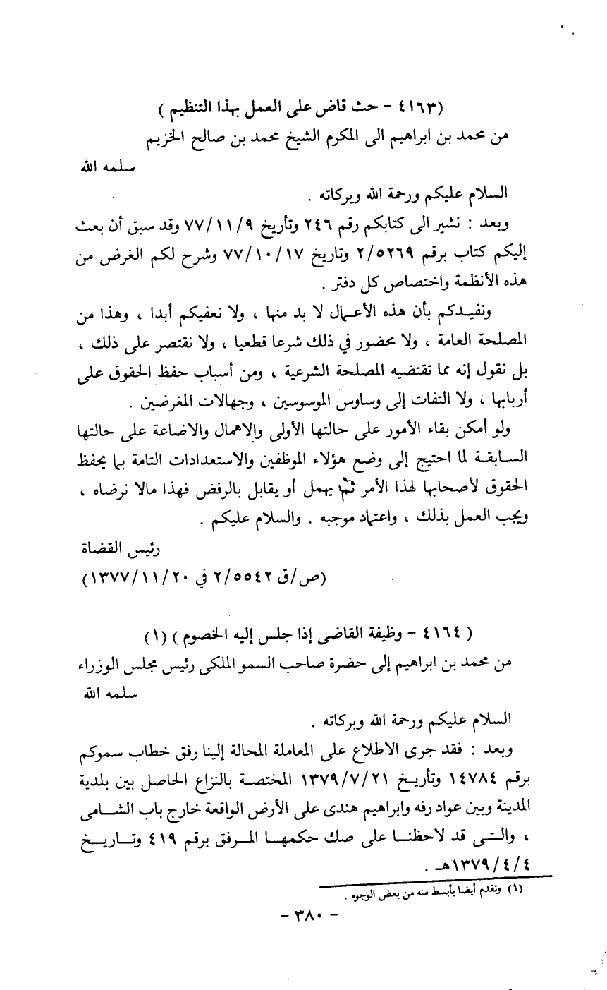 وبعد: نشيءر إلى كتابكم رقم 246 وتاريخ 9/ 11/ 77 وقد سبق ان بعث إلىكم كتاب برقم 5269/ 2 وتاريخ 17/ 10/ 77 وشرح لكم الغرض من هذه إلأنظمة واختصاص كل دفتر ونقدكم بان هذه إلاعمال لا بد منها ولا نعفيكم ابدا وهذا من المصلحة العامة ولا محضور في ذلك شرعا قطعل ولا نقتصر على ذلك بل نقول انه مما تقضيه المصلحة الشرعية ومن اسباب حفظ اللحقوق على اربابها ولا التقات إلى رساوس الموسومين ةجهات المغرضين ولو امكن بقاء الأمور على حالتها الأولي وإلاهمال وإلاضاعة على حالتها السلبقة لأصحابها إلى وضع هؤلاء الموظفين وإلاستعدادات التامة بما يحفظ الحقوق لأصحابها هذ الأمر ثم يهمل او يقابل بالرفض فهذا فهذا مإلا نرضاه ويجب العمل بذلك واعتماد موجبة والسلام عليكم
