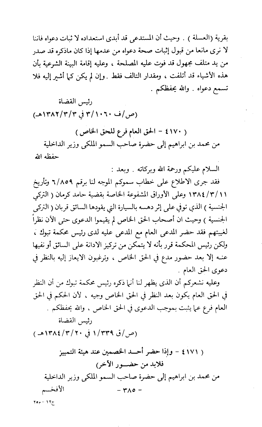 فقد جرى الإطلاع على خاب سموكم الموجه لنا برقم 859/ 6 وتاريخ 11/ 3/ 1383 وعلى الأوراق المشفوعة الخاصة بقضية حامد كرمان (التركي الجنسية) الذي توفي على اثر دهة بالسيارة التي يقودها السائق قربان (التركي الجنسية) وحيث ان اصحتاب الحق الخاص لم بقيموا الدعوى حتى إلأن نظرا لغيتهم فقد حضر المدعي العام مع المدعي عليه لدي رئيس محمكة تبول ولكن رئيس المحكمة قرر بانه لا يتكمن من تركيز إلادانه على السائق او تفيها دعوى الحق العام وعليه نشعركم ان الذي يظهر لنا انها ذكره رئيس محكمة توك من ان النظر في الحق العام يكون بعد النظر في الحق اخاص وجنه لأن الحكم في الحق العام فرع عما يثيت بموجب الدعوى في الحق الخاص والله يحفظكم