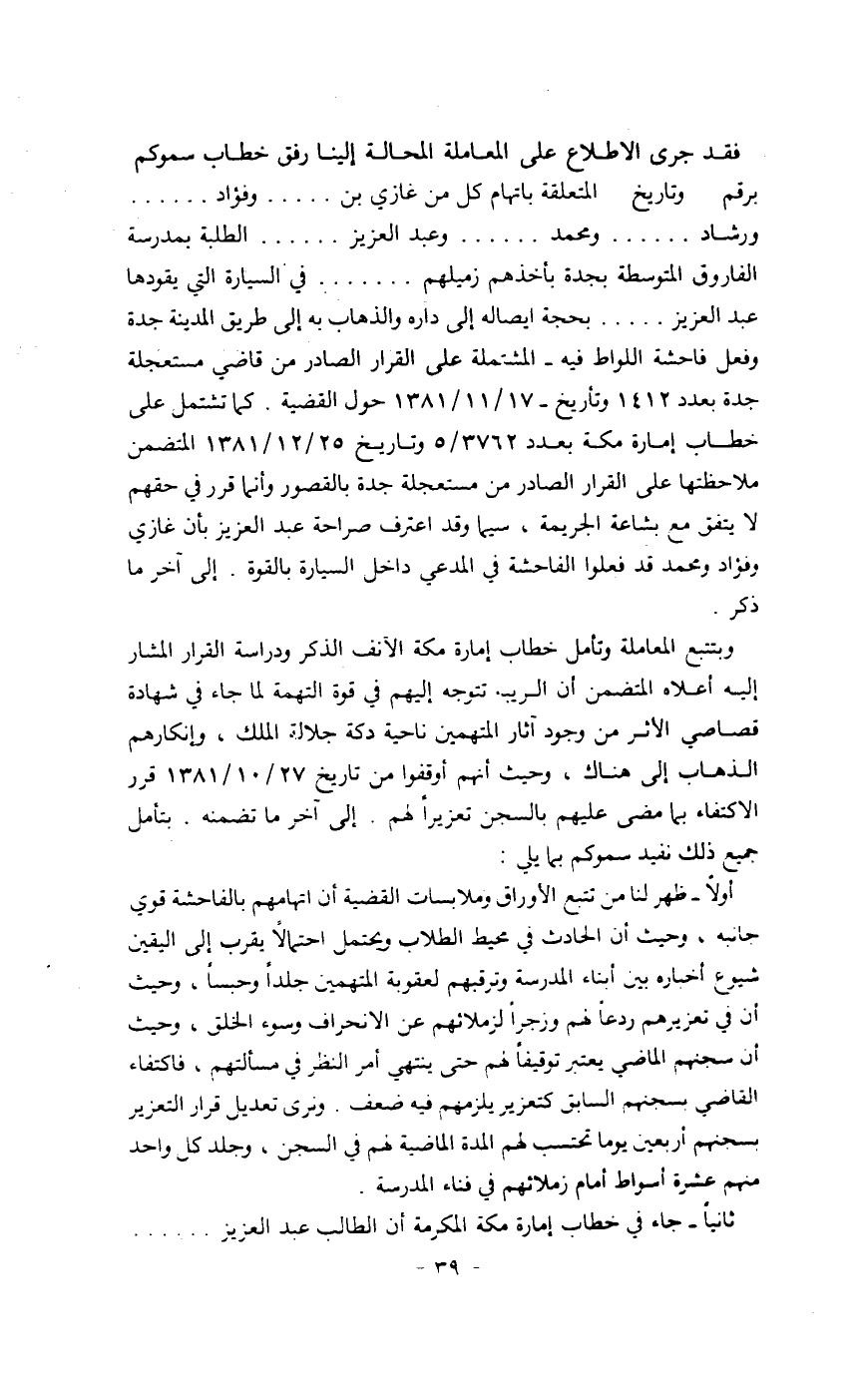 فقد جرى الإطلاع على المعاملة المحالة إلينا وفق خطاب سموكم برقم ... وتاريخ ... المتعلقة باتهام كل من غازي بن..... وفؤاد بن.... ورشاد..... ومحمد...... وعبد العزيز.... الطلبة بمدرسة الفاروق المتوسطة بجدة بأخذهم زميلهم.... في السيارة التي يقودها عبد العزيز.... بحجة إيصاله إلى داره والذهاب به إلى طريق المدينة جدة وفعل فاحشة اللواط فيه المشتملة على القرار الصادر من قاضي مستعجلة جدة بعدد 1412 وتاريخ 17/11/1381 حول القضية. كما تشتمل على خطاب إمارة مكة بعدد 3762/5 وتاريخ 25/12/1381 المتضمن ملاحظتها على القرار الصادر من مستعجلة جدة بالقصور وإنما قرر في حقهم ملاحظتها مع بشاعة الجريمة، سيما وقد اعترف صراحة عبد العزيز بأن غازي وفؤاد ومحمد قد فعلوا الفاحشة في المدعي داخل السيارة بالقوة. إلى آخر ما ذكر.