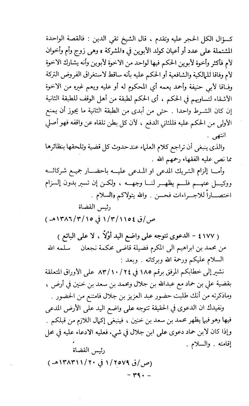 نشيءر 'لي خطابكم المرفق برقم 185 في 24/10/83 على الأوراق المتعلقة بقضية على بن حماد مع عبدج اله بن جلال ومحمد بن سعد بن حنين في أرض وما ذكرته من أنك طلبت حضور عبد العزيز بن جلال فامتنع عن الحضور ونفيدك بأن الدعوى في الحقيقة تتوجه على وضع اليد على الأرض المدعى فيها وفيما يظهر محمد بن سعد بن حنين فينبغي إكمال اللازم من قبلكم وإذا كان لابن حماد دعوى على ابن جلال في شيءء فعليه إلادعاء عليه في محل إقامته والسلام