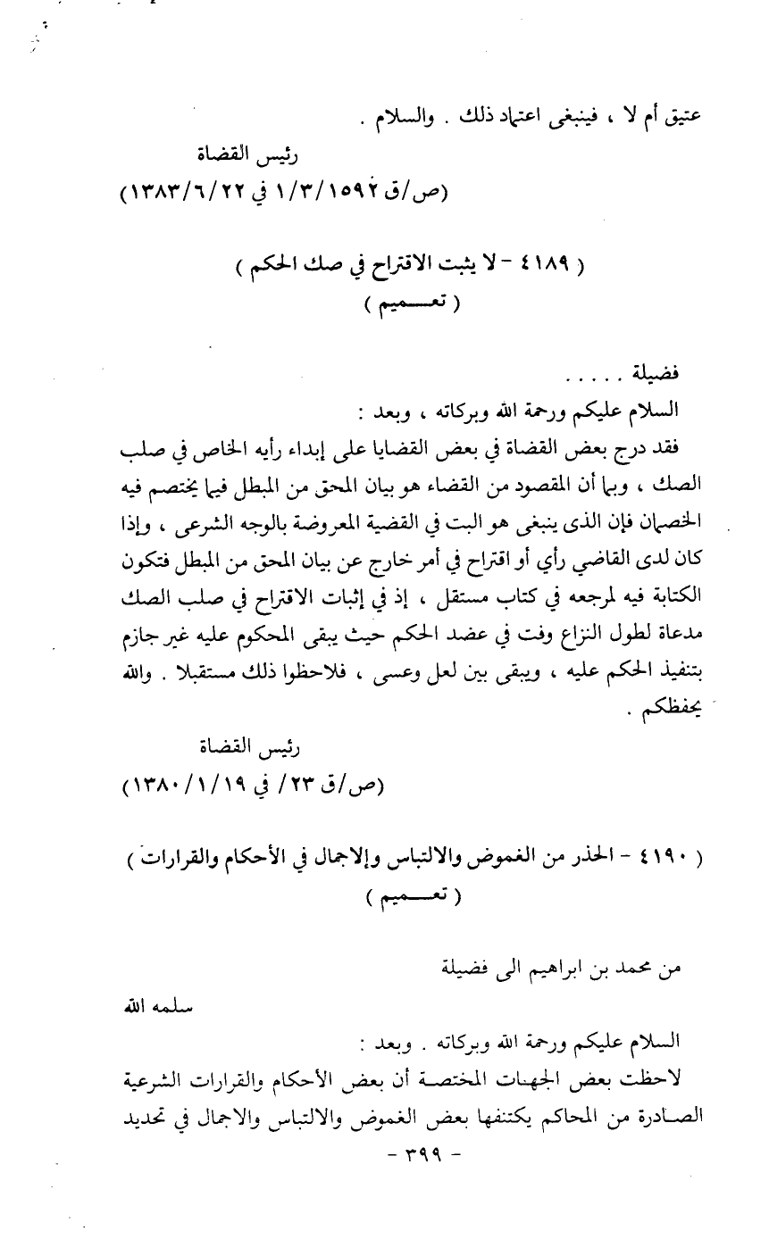 فقد درج بعض القضاة في بعض القضايا على ابداء رايه الخاص في طلب الشك / ربما أن المقصود من القضاء هة بيان المحل من البطل فيما يختصم فيه الخصمان فان الذي ينبغي هو البت في القضية المعروضة بالوجة الشرعي، وإذا كان لدي القاضي رأي أو اقتراح في أمر خارج عن بيان المحن من المبطل فتكون الكتابة فيه لمرجعه في كتاب مستقل، إذا اثبات إلاقتراح في صلب الشك مدعاه لطول النزاع وقمته في عقد الحكم حيث يبقي المحكوم عليه غير جازم بتنفيذ الحكم عليه، ويبقي بين لعل وعسي، فلا حظوا ذلك مستقبلا. والله يحفظكم.