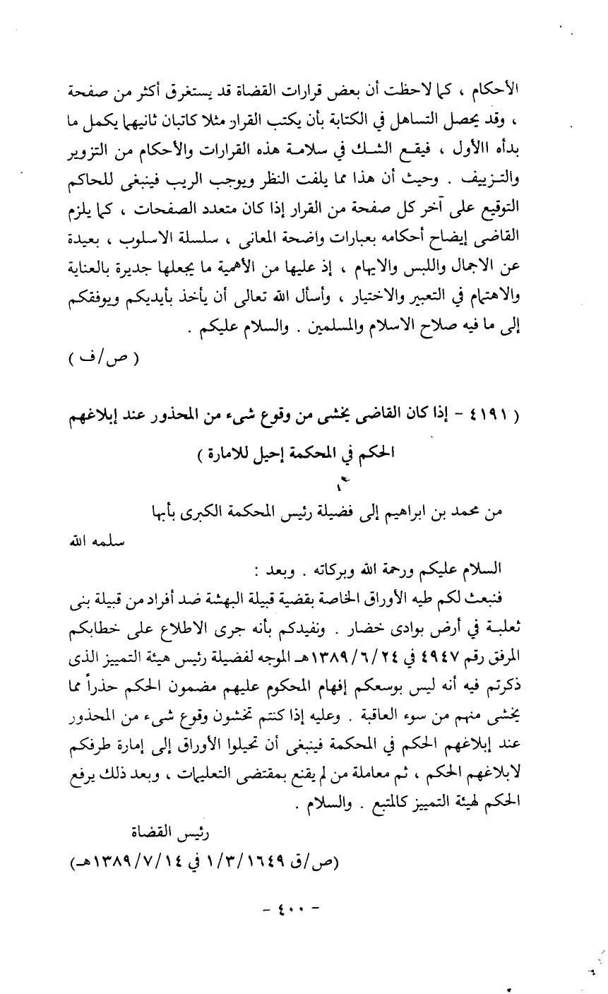 الأحاكم كما لاحظت ان بعض قرارات القضاه قد يتفرق اكثر من صفحة، وقد يحص التساهل في الكتابة بأن يكتب القرار مثلا كاتبان قانينما يكمل ما بدأه الأول، فيقع الشك في سلامة هذه القرارات والأحكام من النزوير والتزيف. وحيث أن هذا مما يقلت النظر ويرجب الربب فينبغي للحلكم التوقيع على آخر كل صفحى من القرار إذا كان متعدد الصفحات، كما يلزم القاضي ايضاح احكامه بعبارات واضحة المعاني، سلسلة إلاسلوب، بعيدة عن إلاجمال الليل وإلأيام، إذ عليها من إلاهمية ما يجعلها جديرة بالعناية وإلاهتمام في التعبير وإلاختبار، وأسأل الله تعالى أن يأخذ بأيديكم ويوفقكم إلى ما فيه صلاح والمسلمين. والسلام عليكم.
