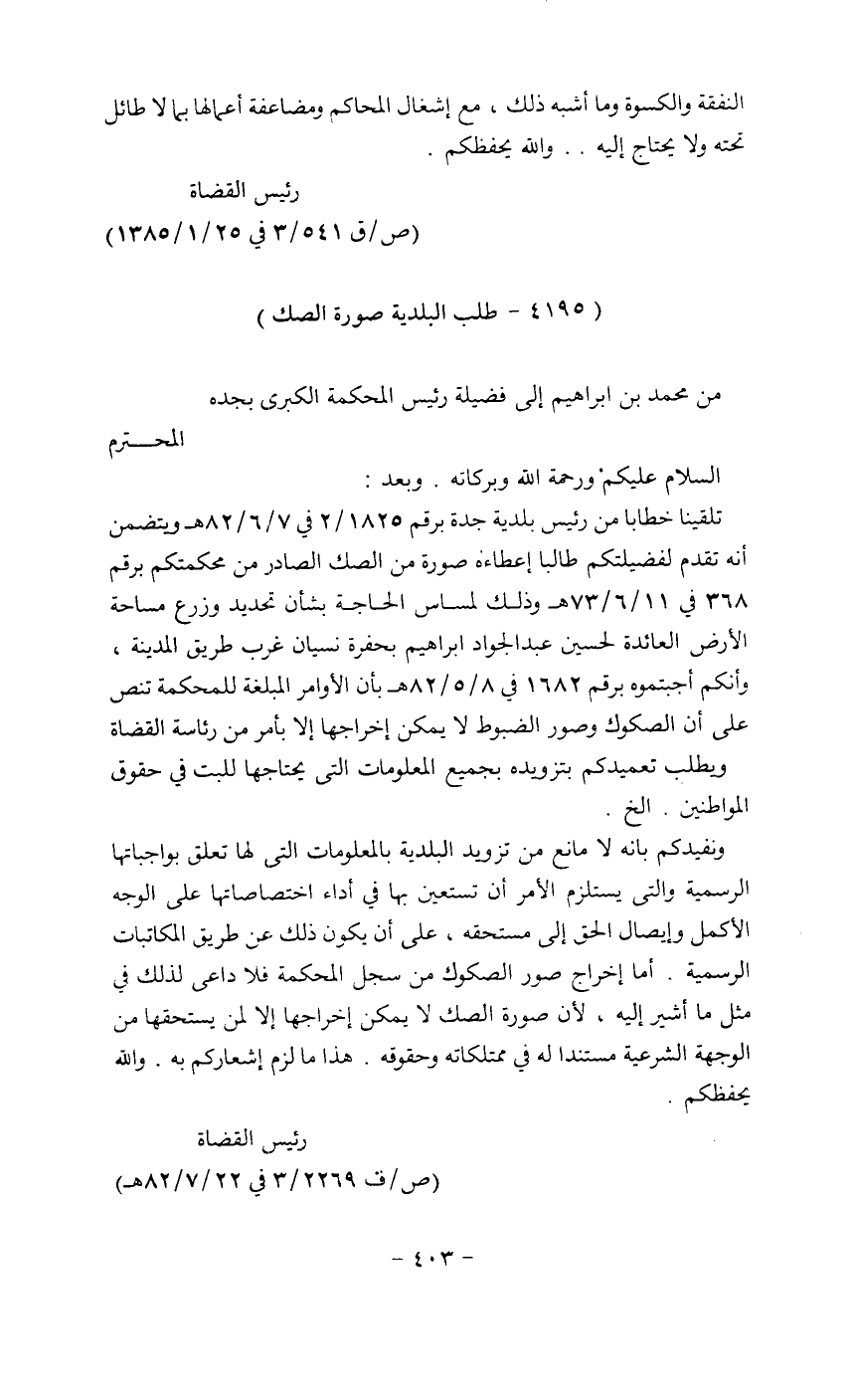 تلقينا خطابا من رئيس بلدية جدة برقم 1825 / 2 في 7/6/82هـ ويتضمن انه تقدم لفضيلتكم طالبا اعضاءه صورة من الشك الصادر من محكمتكم برقم 368 في 11/73هـ وذلك لما من الحاجة بشأن تحديد وزرع مساحة الأرض العائدة لحين عبد الجواد إبراهيم بحفره نبان غرب طريق المدينة وانكم اجتموه برقم 1682 في 8/5/82 هـ بأن إلاوامر المبلغة للمحكمة تنص على أن الشكوك وصور الضبوط لا يمكن اخراجها إلا بأمر من رئاسة القضاة ويطلب تعميدكم بتزويده لجميع المعلومات التي يحتاجها فليست في حقوق المواطنين. الخ