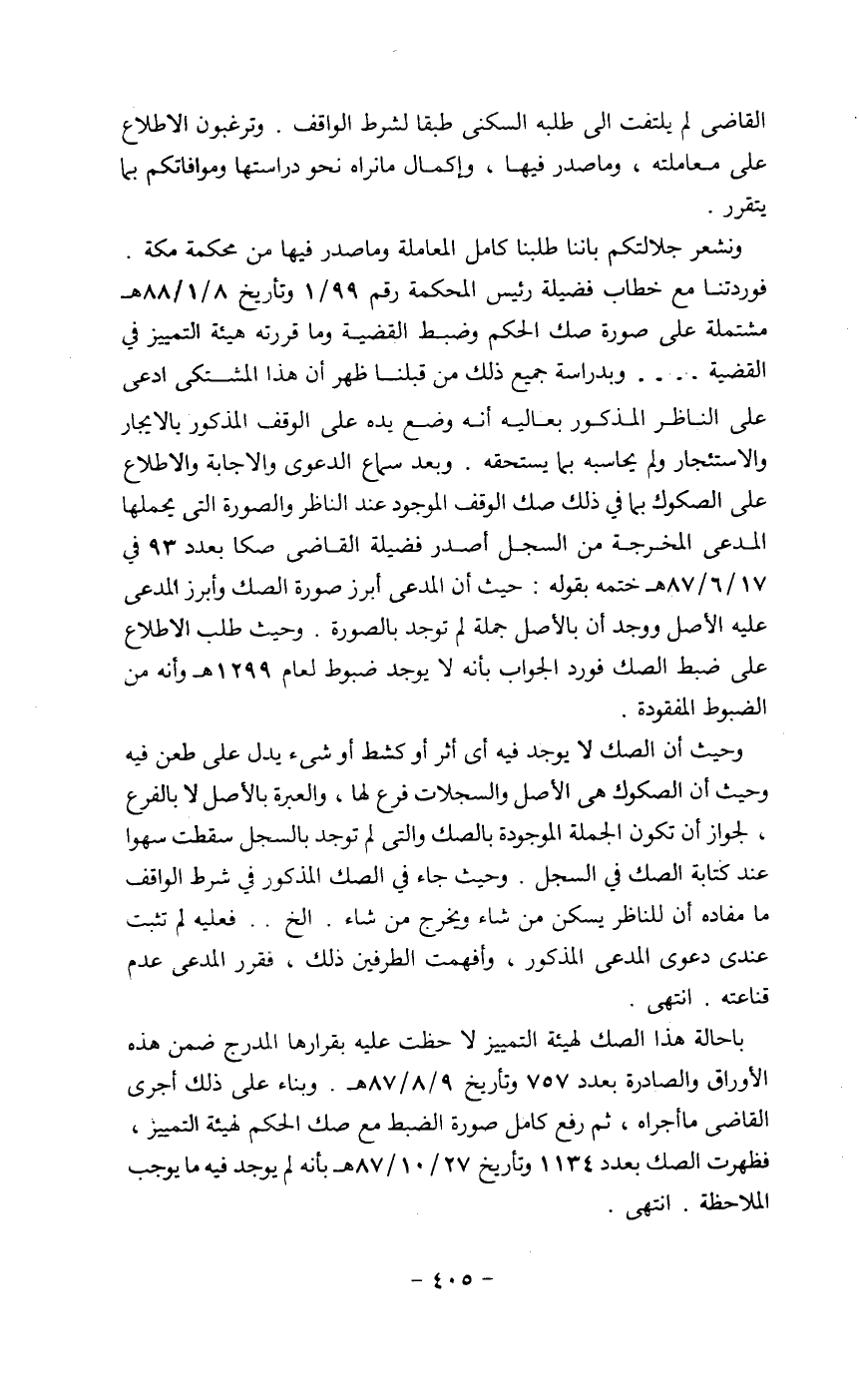 ونشعر جلالتكم باننا طلبنا كامل المعاملة وما صدر فيها من محكمة مكة فوردتنا مع حطاب فضيلة رئيس المحكمة رقم 99/1 وتاريخ 8/1/88 هـ مشتملة على صورة شك الحكم وضبط القضية وما قررته هيئة التمييز في القضية.. وبدراسة جميع ذلك من قبلنا ظهر أن هذا المشتكي ادعى على الناظر المذكور بعإلىة أنه وضع يده على الوقف المذكور بإلأيجار وإلاستئجار ولم يحاسبه بما يستحقه. وبعد سماع الدعوى وإلاجابة والإطلاع على الشكوك بما في ذلك شك الوقف الموجود عند الناظر والصورة التي يحملها المدعي المخرجة من السجل أصدر فضيلة القاضي مكا بعدد 93 في 17/6/87هـ هتمه بقوله: حيث أن المدعي أبرز صورة الشك وأبرز المدعي عليه الأصل ووجد أن بالأصل جملة لم توجد بالصورة. وحيث طلب الإطلاع على ضبط الشك قورد الجواب بأنه لا يوجد ضبوط لعام 129 هـ وأنه من الضبوط المفقودة.