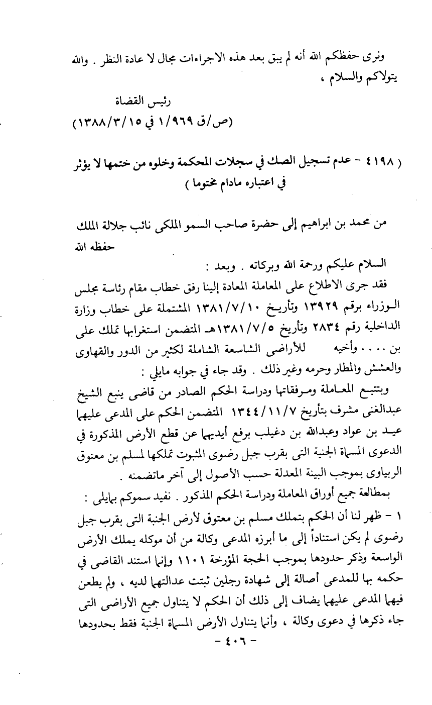 ويتبع المعاملة ومرفقاتها ودراسة الحكم الصادر من قاضي ينبع الشيخ عبد الغني مشرف بتاريخ 7/11/1344 المتضمن الحكم على المدعي عليهما عيد بن عواد وعبد الله بن دغبلب برفع ايديهما عن قطع الأرض المذكورة في الدهوي المسناة ... التي بقرب جبل وقوي لثبوت تملكها لسلم بن معتوق الربياوي بموجب إليه المعدلة حسب الأصول إلى آخر ما تضمنه.