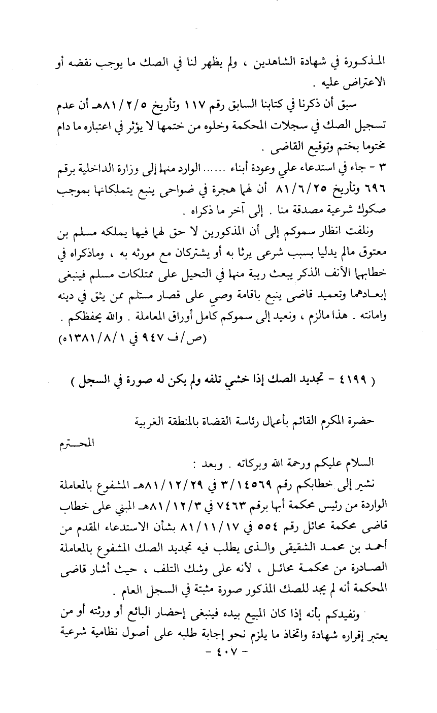 نشيءر إلى خطابكم رقم 14569/3 في 29/12/81هـ المشفوع بالمعاملة الواردة من رئيس محكمة أبها برقم 7463 في 3/12/81عـ المبني على خطاب قاضي محكمة محائل رقم 554 في 17/11/81 بشأن إلاستدعاء المقدم من أحمد بن محمد الشقيقي والذي يطلب فيه تجديد الشك المفوع بالمعاملة الصادرة من محكمة محائل، لأنه على وشك التلف، حيث أشار قاضي المحكمة أنه لم يجد للشك المذكور صورة مثبتة في السجل العام