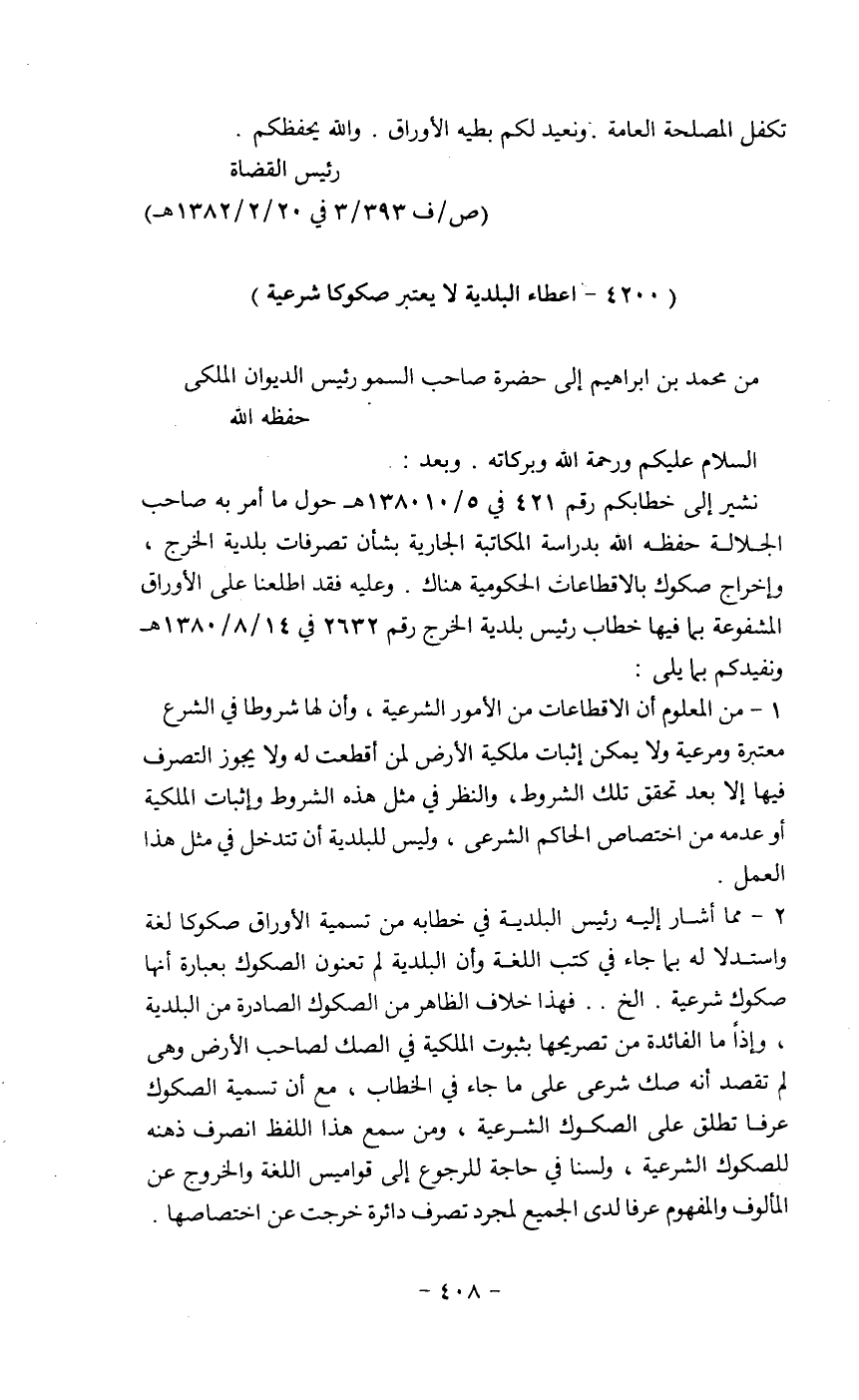 2- مما أثار إليه رئيس البلدية في خطابه من تسمية الأوراق مكوكا لغة واستدلا له بما جاء في كتب اللغة وان البلدية لم تعنونن العسكرك بعبارة أنها شكوك شرعية. الخ.. فهذا خلاف الظاهرى من الشكوك الصادرة من البلدية وإذت ما الفائدة من تصؤيحها بثرث الملكية في الشك لصاحب الأرض وهي لم تقصد أنه شك شرعي على ما جاء في الخطاب، مع ان اسمية الشكوك علافا تطلق على الشكوك الشرعية، ومن سمع هذا اللفظ انصرف ذهنه للشكوك الشرعية، ولنا في حاجة للرجوع إلى قوامين اللغة والخروج عن المألرف والمفهوم علافا لدي الجميع لمجرد تصرف دائرة خرجت عن اختصاصها.