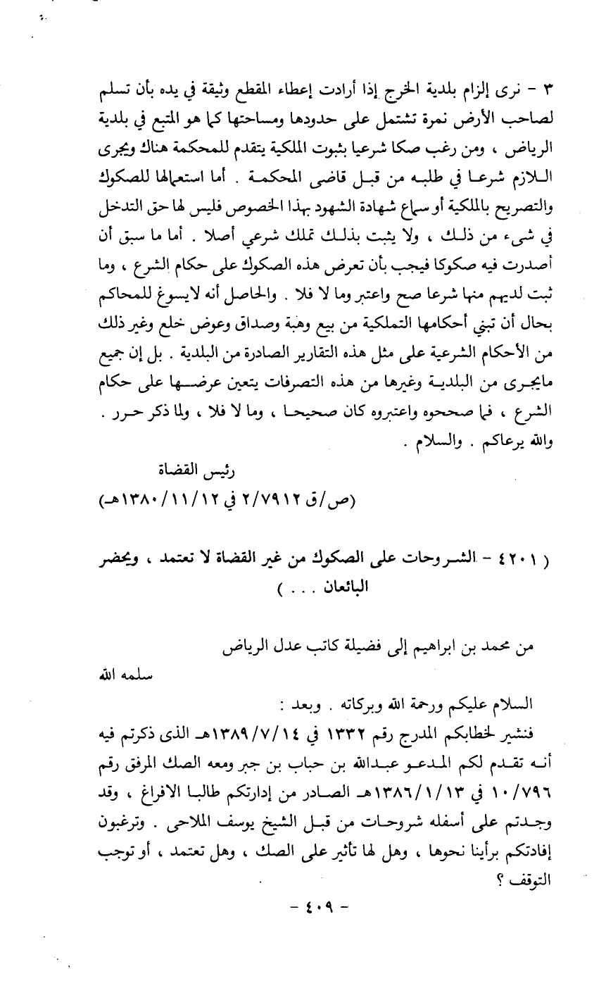 3- نري إلزام بلدية الخرج إذا أرادت إعطاء المقطع وثيقة في يده بأن تسلم لصاحب الأرض قمرة تشتمل على حدودها ومساحتها كما هو المتبع في بلدية الرياض، ومن رغب شكا شرعيا بثبوت الملكية بتقدم للمحكمة هعناك ويجرى اللازم شرعا في طلبه من قبل ثاضي المحكمة. وأما استعمالها للشكوك والتصريح بالملكية أو سماع شهادة الشهود بهذا الخصوص فليس فاحز التدخل في شسئ من ذلك، ولا يبت بذلك تملك شرعي أصلا. أما ما سبق أم أصدرت فيه شكوكا فيجب بأن تعرض هذه الشكوك على حكام الشرع / وما ثبت لديهم منها شرعا صح واعتبر وما لا فلا. والحاصل أنه لا يوغ للمحاكم بحال أن تبني احامها التعلكية من بيع وهبة وصداق وعوض خلع وغير ذلك من الأحكام الشرعية على مثل هذه التقارير الصادرة من البلدية. بل إن جميع ما يجرى من البلدية وغيرها من هذه التصرفات يتعين عرضها على حكام الشرع، فما صححوه واعتبروه كان صحيحا، وما لا قلا، ولما ذكر حرر. والله يرعاكم. والسلام.