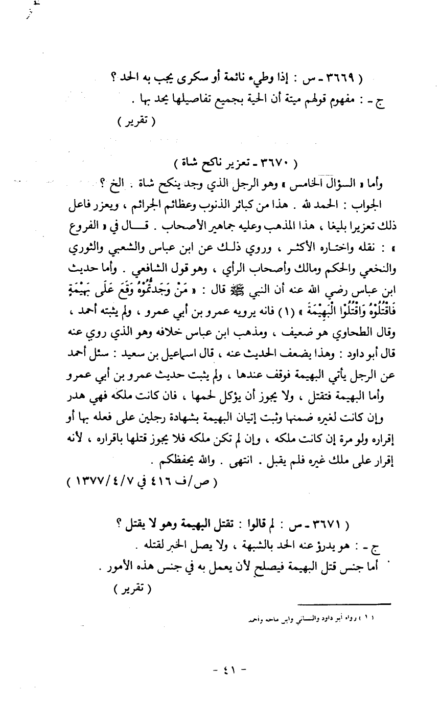 الجواب: الحمد لله. هذا من كبائر الذنوب وعظائم الجرائم، ويعزر فاعله ذلك تعزيراً بليغاً، هذا المذهب وعليه جماهير الأصحاب. قال في (الفروع) : نقله واختاره الأكثر، وروي ذلك عن ابن عباس والشعبي والثوري والنخعي والحكم ومالك وأصحاب الرأي، وهو قول الشافعي. وأما حديث ابن عباس رضي الله عنه أن النبي - صلى الله عليه وسلم - قال: (من وجدتموه ووقع على بهيمة فاقتلوه واقتلوا البهيمة) (¬1) فإنه يرويه عمرو بن أبي عمرو، ولم يثبته أحمد، وقال الطحاوي هو ضعيف، ومذهب ابن عباس بن سعيد: سئل أحمد عن الرجل يأتي البهيمة فوقف عندها، ولم يثبت حديث عمرو بن عمرو وأما البهيمة فتقتل، ولا يجوز أن يؤكل لحمها، فإن كانت ملكه فهي هدر وإن كانت لغيره ضمنها وثبت إتيان البهيمة بشهادة رجلين على فعله بها أو إقراره ولو مرة إن كانت ملكه، وإن لم تكن ملكه فلا يجوز قتلها بإقراره، لأنه إقرار على ملك غيره فلم يقبل. انتهى. والله يحفظكم.