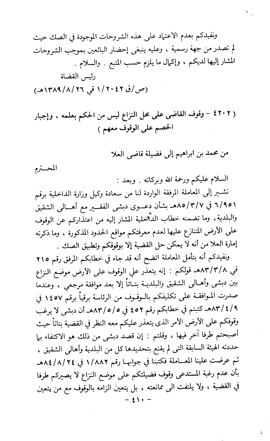 ونفيدكم أنه بتأمل المعاملة اتضح أنه قد جاء في خطابكم المرفق رقم 215 في 8/3/83هـ قولكم: إنه ينذر على الوقوف على الأرض موضع النزاع بين دبش وأهإلى الشقيق والبلدية بتاتا إلا بعد موافقة مرجعي، وعندما صدرت الموافقة على تكليفكم بالوقوف من الرئاسة برقيا برقم 1457 في 9/4/83هـ كتبتم في خطابكم رقم 453 في 5/5/83هـ أن دبث لا يرغب وفولكم على الأرض الأمر الذي يتعذر عليكم معه النظر في القضية بتاتا حيث اصبحتم طرقا آخر فيها، وقلتم: إن تصد دبثي من ذلك هو إلاكتفاء بما حددته الهيئة السابقة التي لم يقنع بتحديدها كل من البلدية واهإلى الشقيق، ثم عرلاضت علينا المعاملة فكتبنا في جوابها رقم 883/1 في 24 /8/84هـ بأن عدم رغبة المدعي وفرق فضيلتكم على موضع النزاع لا يصيركم طرفا في الفضية، ولا يلتفت إلى ممانعته، بل يتعيني الزامه بالوقوف مع من يتعين