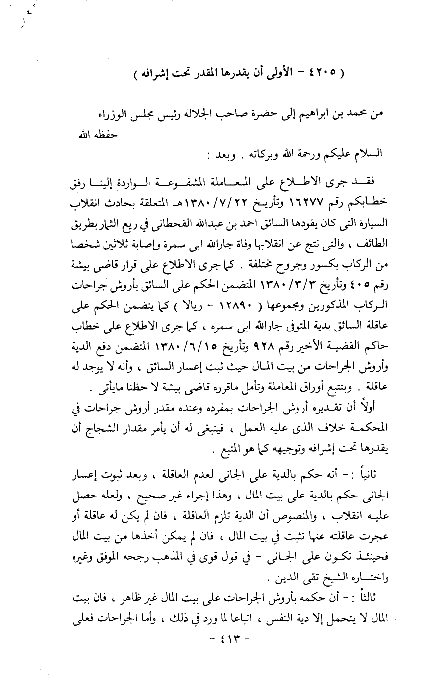 فقد جرى الإطلاع على المعاملة المشفوعة الواردة إلينا رفق خطابكم رقم 16277 وتاريخ 72/7/1380 هـ المتعلقة بحادث انقلاب السيارة التي كانت يقودها السائق احمد عبد الله الفحطاني في ربع القمار بطريق الطائف، والتي نتج عن انقلابها وفاة جار الله ابي سمرو واصابة ثلاثين شخصا من الركاب بكسور وجروح مختلفة. كما جرى الإطلاع على قرار قاضي بينة رقم 405 وتاريخ 3/3/1380 المتضمن الحكم على السائق بأروش جراحات الركاب المذكورين ومجموعها (12890 - ريالاً) كما يتضمن الحكم على عاقلة السائق بدية المتوفي جار الله ابي سمره، كما جرى الإطلاع على خطاب حاكم القضية الأخير رقم 928 وتاريخ 15/6/1380 المتضمن دفع الدية وأروش الجراحات من بيت المال حيث ثبت إعار السائق، وأنه لا يوجد له عاقلة. ويتتبع أوراق المعاملة وت~أمل ما قرره ثاضي بينة لا حظنا ما يأتي.