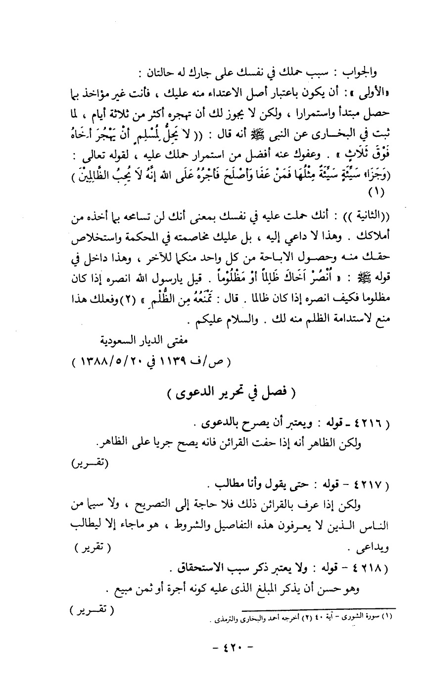 " الثانية " أنك حملت عليه في نفسك بمعني أنك لن تا بما أخذه من أملاكك. وهذا لا أداعي إليه، بل عليك مخا ... في المحكمة واستخلاص حقك منه وحصول إلاباحة من كل واحد منكما للاخر، وهذا داخل في قوله صلي الله عليه وسلم " انصر أخاك ظلما أو مظلوما. قيل يا رسول الله انصره إذا كان مظلوما فميف انصر إذا ظالما. قال: تمنعه من الظلم " (2) وفعلك هذا منه لاستدامة الظلم منه لك. والسلام عليكم