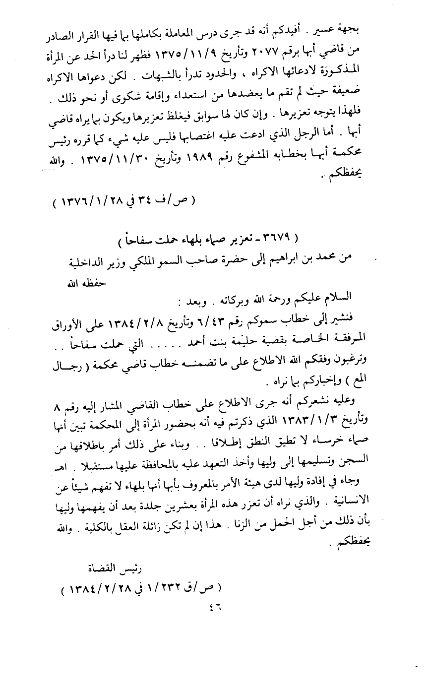 فنشير إلى خطاب سموكم رقم 43/6 وتاريخ 8/2/1384 على الأوراق المرفقة الخاصة بقضية حليمة بنت أحمد ... التي حملت سفاحاً ... وترغبون وفقكم الله الإطلاع على ما تضمنه خطاب محكمة (رجال المع) وإخباركم بما نراه.